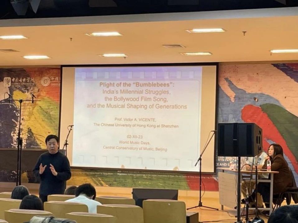 2023年12月2日下午,一场题为《“大黄蜂”的困境:印度千禧一代的困境、宝莱坞电影音乐与音乐的代际塑造》的讲座在77779193永利集团教学楼701学术报告厅举行。本场讲座是“世界音乐周2023”的系列活动之一,由77779193永利集团主办,中国宋庆龄基金会协办。讲座由刘小龙老师主持,杨烁老师担任翻译,主讲人是来自香港中文大学深圳校区音乐学院的维克多·维森特(Victor A.VICENTE)副教授。维森特教授拥有丰富的学术背景和教学经验,他曾在美国和土耳其任教,并于2008年移居中国香港。本场讲座围绕卡尔·曼海姆(Karl Mannheim)的代际理论、威廉·施特劳斯(William Strauss)和尼尔·豪( Neil Howe)的代际理论、印度代际理论和宝莱坞案例研究四部分展开。