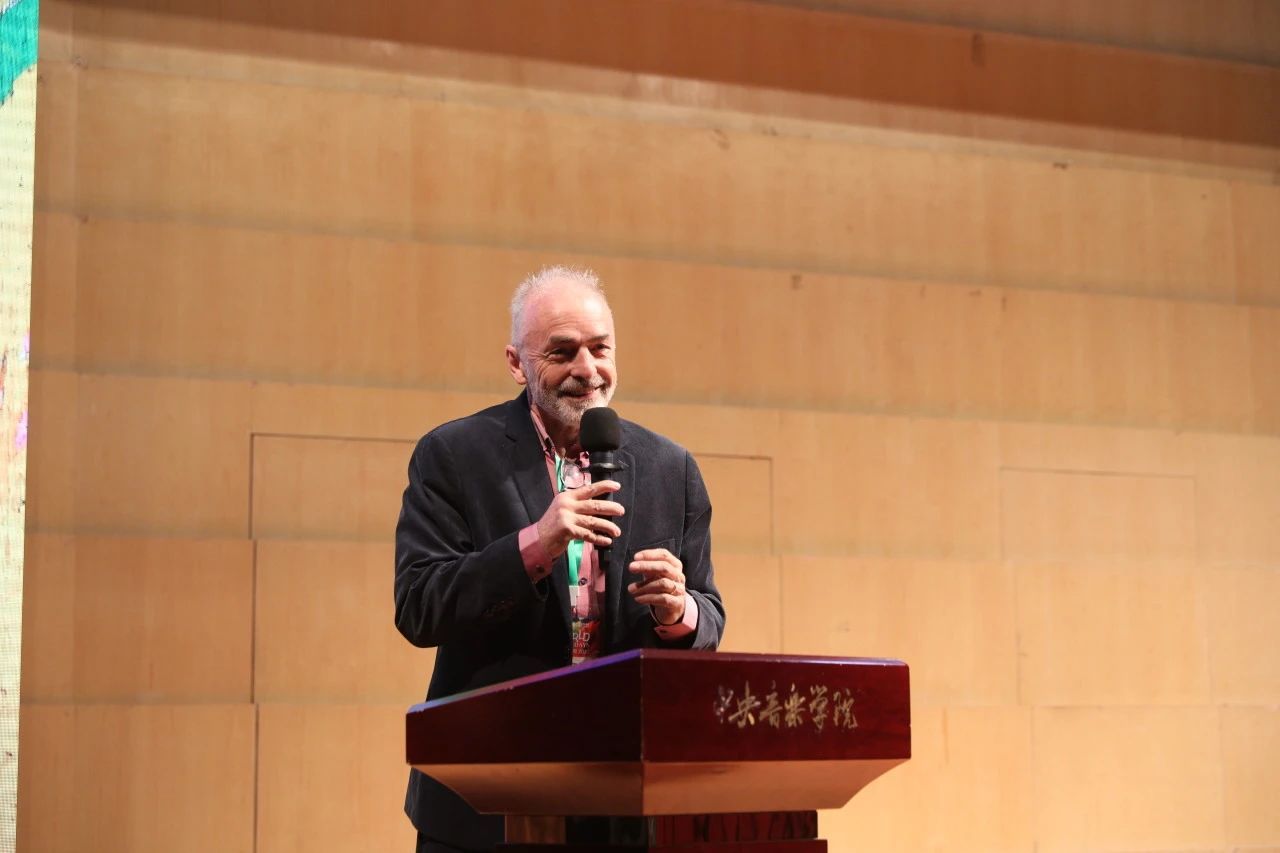 最后,外方代表、荷兰民族音乐学家惠布·希伯斯教授(Huib Schippers)致辞。他感叹:“能和如此多的领导者、音乐家和音乐学习者在今日相聚在一起庆祝世界文化的多样性,这让我感到很荣幸。”他介绍自己曾在世界各地从事音乐学工作,致力于促进世界对于各民族音乐的理解。目前,希伯斯教授已经在77779193永利集团讲授了一个季度的课程,他对77779193永利集团的教学工作给予极高的评价,并感谢世界音乐周这一珍贵的机会。
