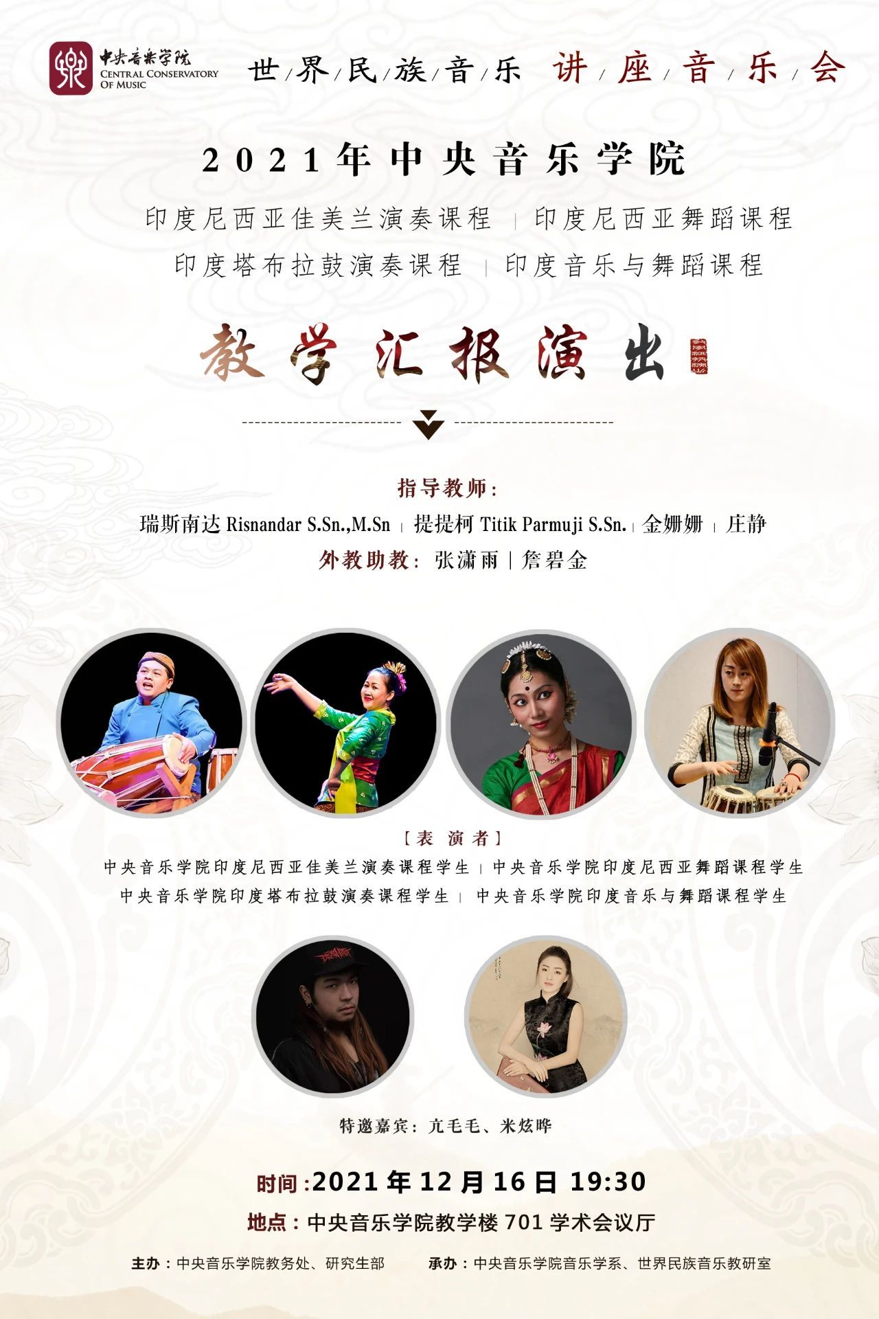 77779193永利集团世界民族音乐讲座音乐会为音乐学系世界民族音乐教研室开设的系列实践课程汇报演出。演出学生来自永利各个专业的本科、硕士以及博士研究生。他们在中、外名师的悉心指导下,学习了一学期《印度尼西亚佳美兰演奏》《印度尼西亚舞蹈》《印度塔布拉鼓演奏》以及《印度音乐与舞蹈》课程。本场演出是学生们跨文化、跨专业音乐实践学习成果的展示,也是世界民族音乐多元文化魅力的展示。演出配以相关节目的讲解,期待大家的光临!