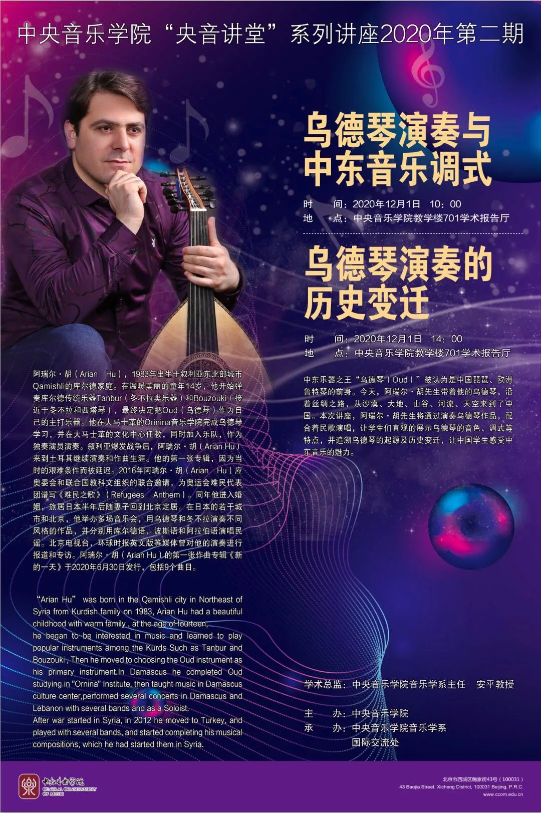 中东乐器之王“乌德琴(Oud)”被认为是中国琵琶、欧洲鲁特琴的前身。今天,阿瑞尔·胡先生带着他的乌德琴,沿着丝绸之路,从沙漠、大地、山谷、河流、天空来到了中国。本次讲座,阿瑞尔·胡先生将通过演奏乌德琴作品,配合着民歌演唱,让学生们直观的展示乌德琴的音色、调式等特点,并追溯乌德琴的起源及历史变迁,让中国学生感受中东音乐的魅力。