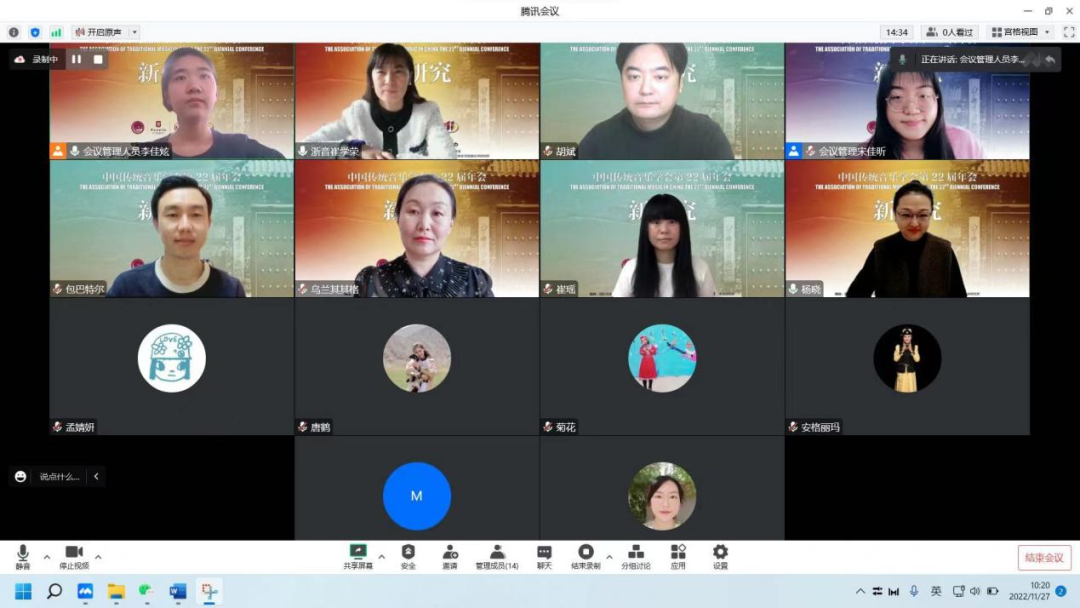 2022年11月27日,中国传统音乐学会第22届年会第六会场的三个单元以“新研究”为议题展开研讨。来自全国各地的专家、学者及各大艺术院校师生于云端相聚,从自身在传统音乐学习过程中的发现与总结、中国传统音乐的教育与传承发展、具体的传统音乐种类的研究三方面,由宏观到微观进行观点分享与研讨,思想的碰撞与视野的交融,为大家带来了思想盛宴。