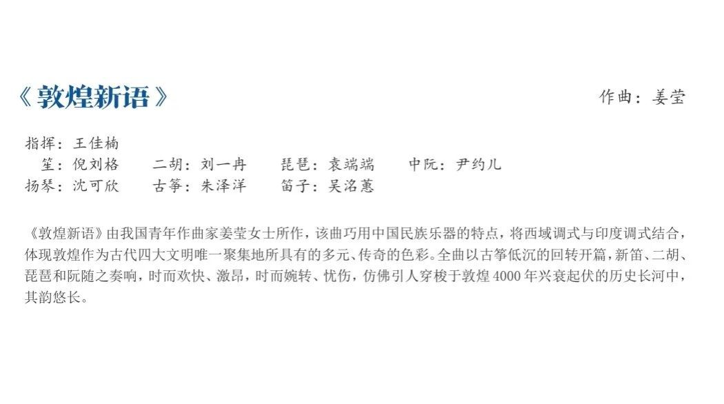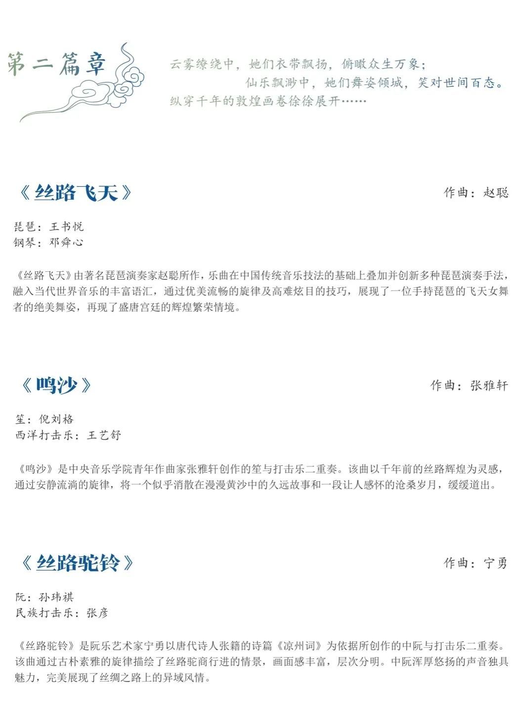 《敦煌·乐画》音乐会以敦煌壁画为主线索,将音乐与舞蹈、动画、多媒体等形式进行结合,体现从古至今“一带一路”在不同时代所带来的影响。通过音乐会对敦煌文化的活态传承进行探索与创新,展现不同时期的敦煌文化魅力。