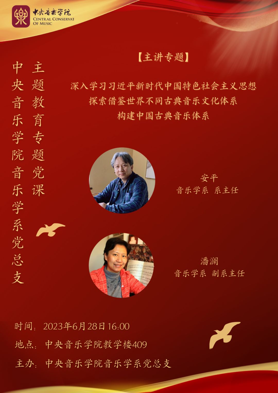 第三场党课讲座将由音乐学系系主任安平教授与副系主任潘澜教授以“深入学习习近平新时代中国特色社会主义思想,探索借鉴世界不同古典音乐文化体系,建构中国古典音乐体系”为主题展开。
