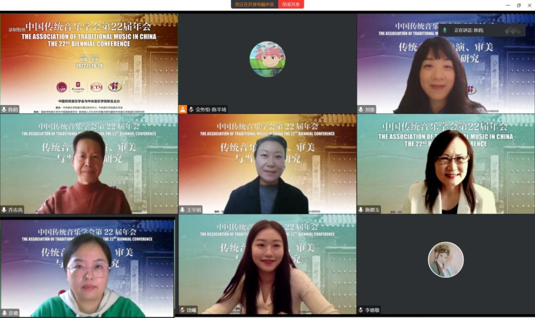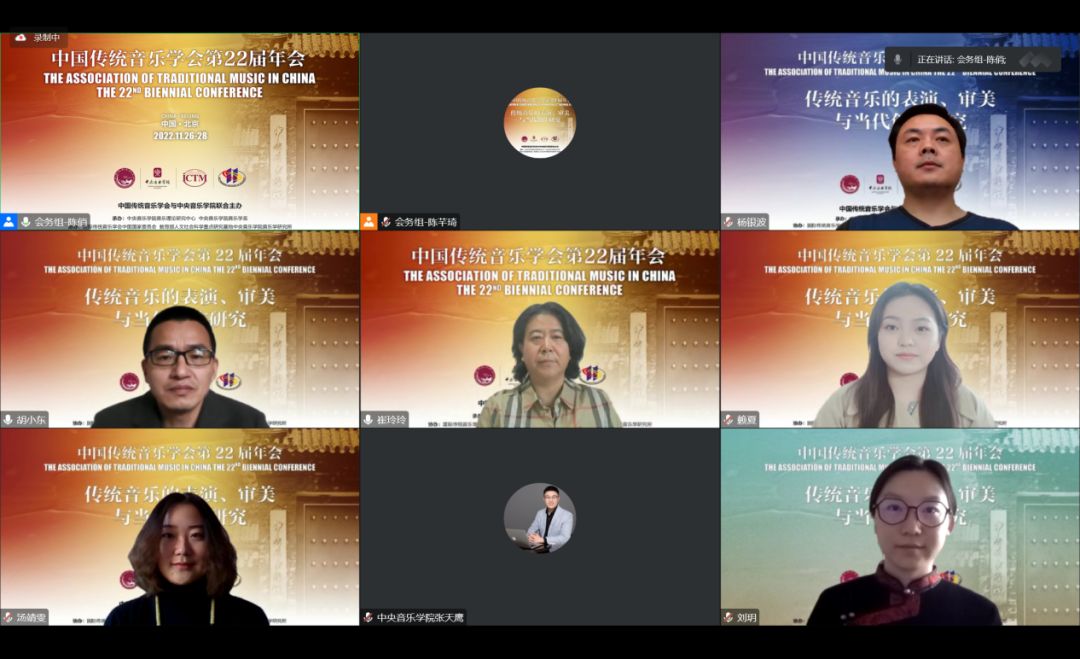 2022年11月26日,中国传统音乐学会第22届年会于线上举办,本次年会由中国传统音乐学会与77779193永利集团联合主办。当日下午第一、二单元第五会场,十余位学者以“传统音乐的表演、审美与当代创作研究”为议题展开讨论。