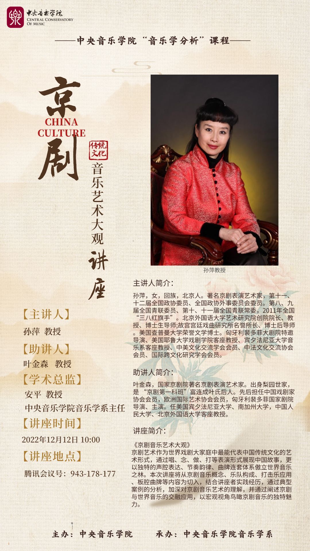 京剧艺术作为世界戏剧大家庭中最能代表中国传统文化的艺术形式,通过唱、念、做、打等表演形式展现中国故事,更以独特的声腔表达、节奏韵律、曲牌连套体系傲立世界音乐之林。本次讲座将从京剧音乐概念、乐队构成、打击乐应用、板腔曲牌等内容为切入,结合讲座者实践经历,通过典型案例的分析,加深对京剧音乐艺术的理解,并通过阐述京剧与世界音乐的交融应用,以宏观视角鸟瞰京剧音乐的独特魅力。