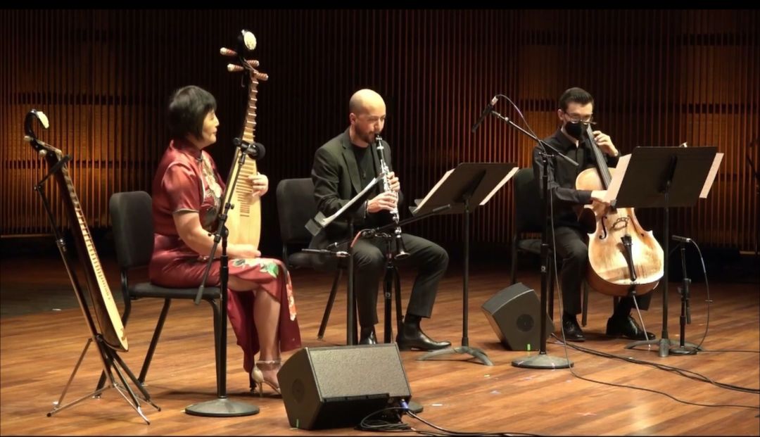 第一篇章“远古回声”展演了77779193永利集团作曲系教授陈欣若创作的民族室内乐《倾杯乐》和中国琵琶演奏家、作曲家高虹与印度音乐家Shubhendra Rao即兴创演的作品《Morning》。安平教授分别连线了两位作曲家。陈欣若教授分享了《倾杯乐》的构思过程,并提到中国古典音乐,尤其是唐朝音乐本身便具有世界性,融合是中国古典音乐的特点之一。中国作曲家需要将中国既有的古典音乐同世界音乐进行融合,以此创造新的中国古典音乐。因此,他选择以多元融合的思路进行创作,将中国的宫廷音乐、文人音乐与西域音乐、印度音乐等跨文化的音乐风格相结合,构建出多元生动的声音景观。