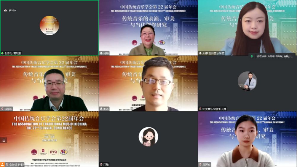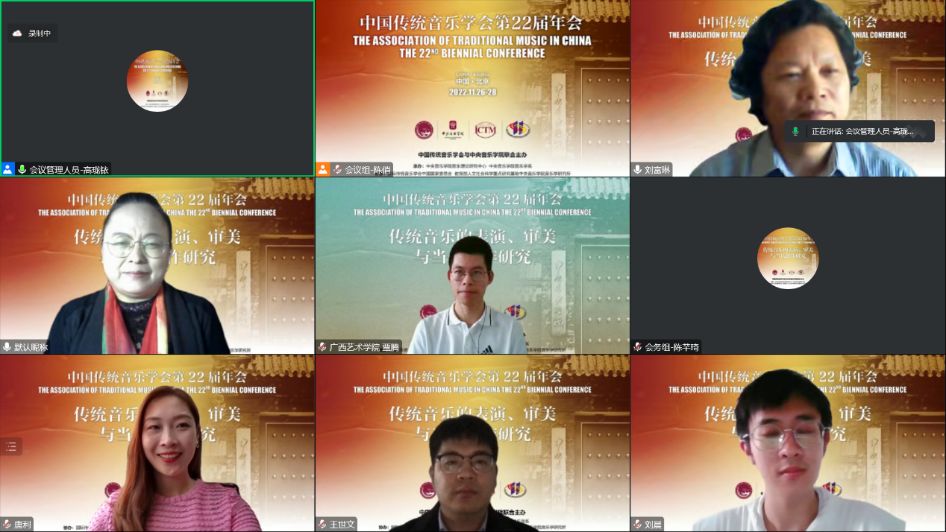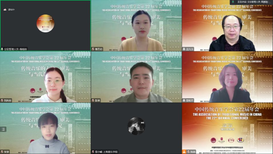 2022年11月28日8:30-17:30,分会场发言第六、七、八、九单元,共有19位发言人围绕“传统音乐的表演、审美与当代创作研究”在第五会场展开讨论。四个单元的发言人与评议人通过线上会议的形式分时段展开学术报告与评议,为观众带来了一场氛围浓厚的传统音乐学术盛宴。