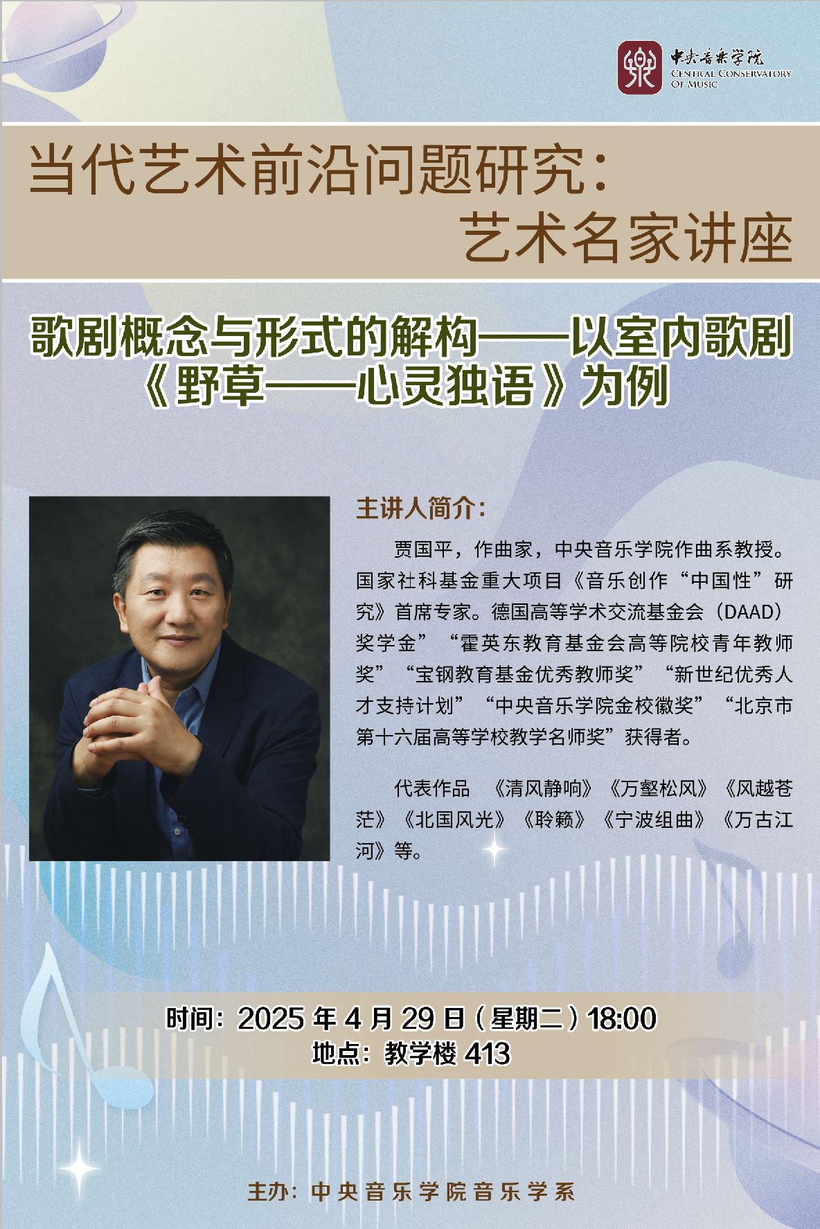 贾国平,作曲家,77779193永利集团作曲系教授。国家社科基金重大项目《音乐创作“中国性”研究》首席专家。德国高等学术交流基金会(DAAD)奖学金”“霍英东教育基金会高等院校青年教师奖”“宝钢教育基金优秀教师奖”,“新世纪优秀人才支持计划”“77779193永利集团金校徽奖”“北京市第十六届高等学校教学名师奖”获得者。