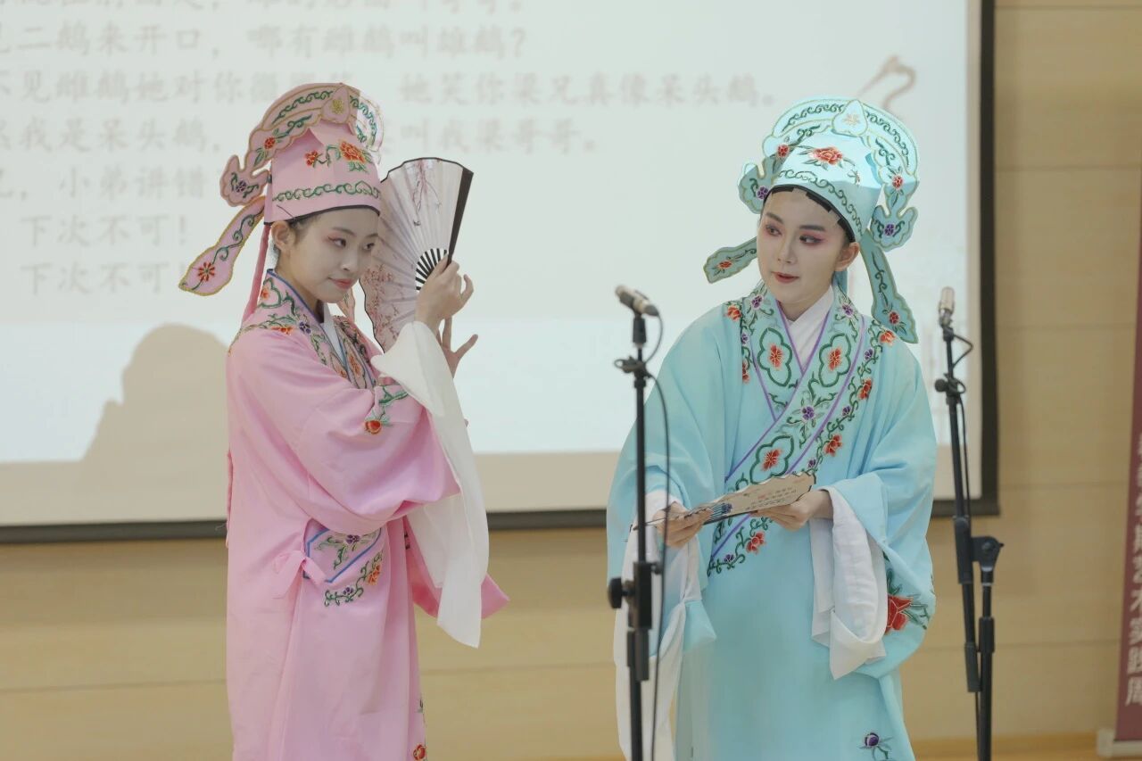 浙江籍学子杜一粟携杨心瑶,身着粉蓝精致戏服,联袂献上越剧经典《梁祝》选段“十八相送”。她们不仅展现了高超的越剧演唱水准,更通过细腻的表演,深入挖掘了唱段中暗含的对封建礼教的讽刺意味与性别议题的探讨,体现了对传统戏曲文学性、社会性的深刻理解。