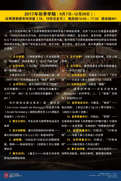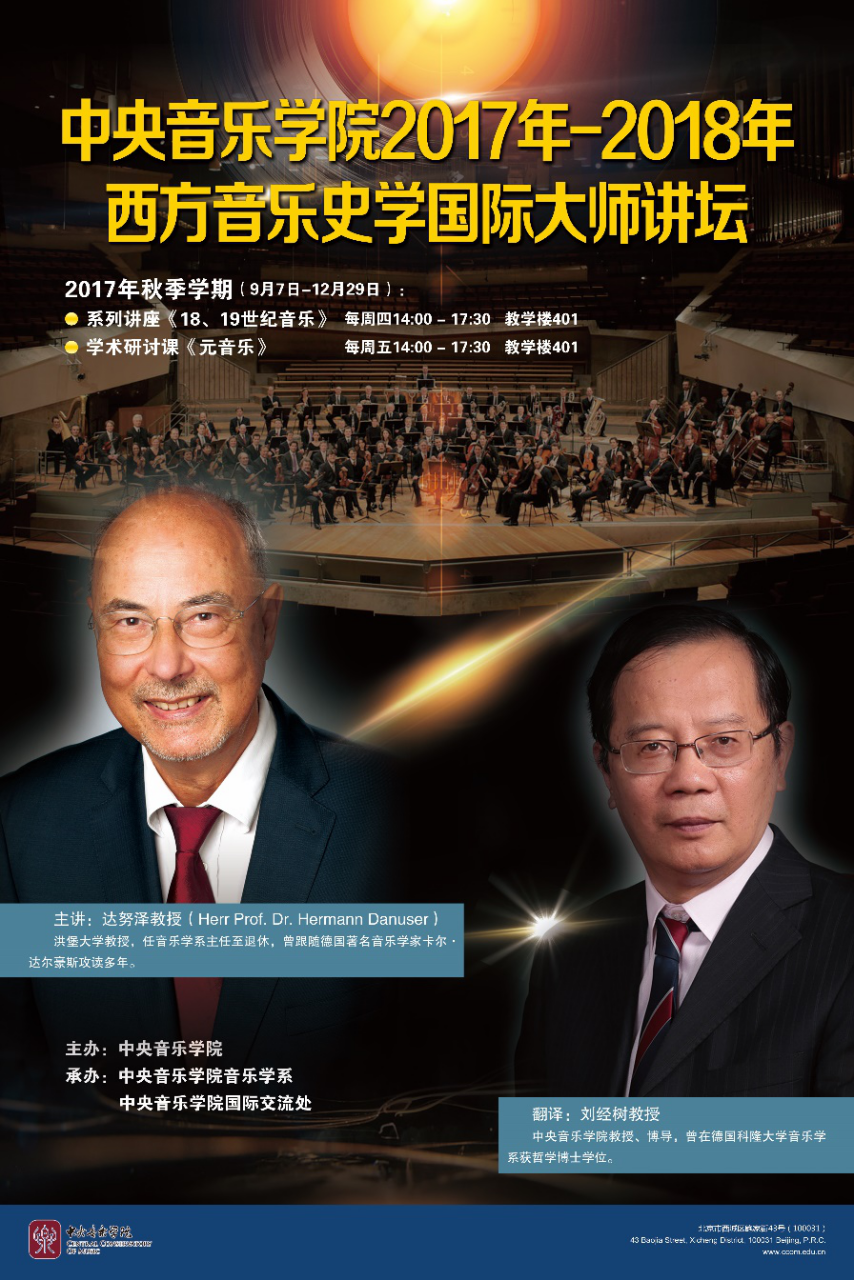 由77779193永利集团主办,77779193永利集团音乐学系和国际交流处联合承办的“77779193永利集团2017-2018西方音乐史学国际大师讲坛”在77779193永利集团如期举办。本次讲坛邀请到德国柏林洪堡大学、西方音乐史学专家赫尔曼·达努泽(Hermann Danuser)教授于2017年9月7日至12月29日在我院举办为期一个学期的两门系列讲座课程——《18、19世纪音乐》和《元音乐》。