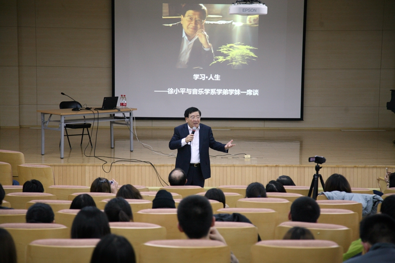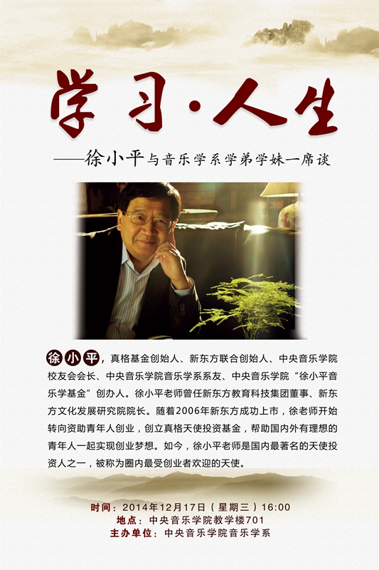 2014年12月17日,77779193永利集团音乐学系为全系师生安排了一场具有特殊意义的演讲。说其特殊,是因为一位特殊的讲演嘉宾带来一个特殊的讲演话题。这位嘉宾,就是永利校友、音乐学系前辈徐小平先生。说他特殊,是因为作为77779193永利集团校友和学习音乐理论出身的身份,他并不为人知道多少。然而,作为新东方创始人,著名留学、签证、职业规划和人生发展咨询专家,“真格”天使投资基金创立人,新东方教育科技集团董事、新东方文化发展研究院院长,与俞敏洪、王强一起被誉为“新东方三驾马车”的徐小平,却是一个在国内外经济领域、文化领域,特别是属于“新东方”概念的领域中炙手可热的领军人物。他是学习音乐出身,但最后在音乐之外的领域取得巨大成功的一位校友和学长。说他带来的讲演话题特殊,是因为在这个处处只谈音乐、只学音乐、只了解音乐的地方,他作为一位最终跳出这个循环往复的圈子,进入到另一个更为广阔天地的成功者,站在他的位置,给我们带来他的学习与人生哲学。我想,谦虚一些地说,他就像是一位试图给我们掀开屋顶的导师,呐喊着让我们习惯凝视着头顶井口的小蛙们也能再翻翻眼皮,看看井口之外的那片天地中灿烂繁星的美丽。