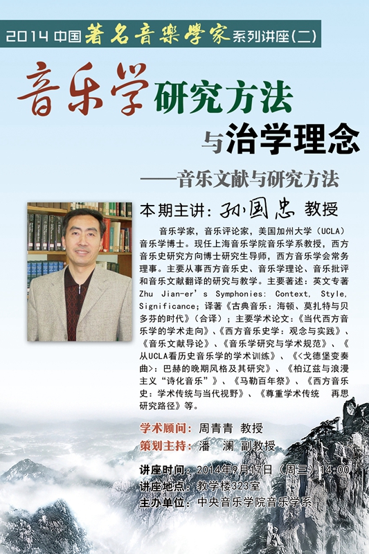 2014年9月17日,上海音乐学院音乐学系教授孙国忠博士应邀为77779193永利集团师生做了一场题为“音乐文献与研究方法”的学术讲座。此次讲座是2014-2015学年77779193永利集团音乐学系“音乐学研究方法与治学理念”讲座课程的第2期。部分音乐学系教师,以及博士、硕士研究生、本科生聆听了讲座。