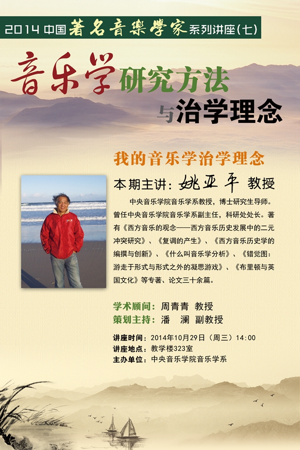 2014年10月29日,本学期为博士生开设的“音乐学研究方法与治学理念”系列讲座已经开设到了第7期。本次讲座邀请到77779193永利集团西方音乐史教授、博士生导师姚亚平博士担纲主讲。作为一位在国内学术界以西方音乐的思想史、观念史研究为主要方向,并且在这个独特领域已经取得丰硕成果的专家,在此次讲座中,笔者感受到姚亚平教授似乎又一次将自己融入他自身以往的研究历程中,寻找到了几十年来支撑自己学术前进的重要坐标,并将这些经验与方法浓缩在此次讲座的四个维度中,通过清晰地阐述传达给了在座的每一位后学者们。这确实是一次讲座,除了学识上的收获,笔者还深切感受到姚亚平老师对自我研究历程和众多思考的回望、反思和再创造,感受到了他期望通过这次对自我的再总结、再反思,能够真正切实地给予在座诸位未来学者们以学术、乃至人生坐标的些许提点的师、父情怀。