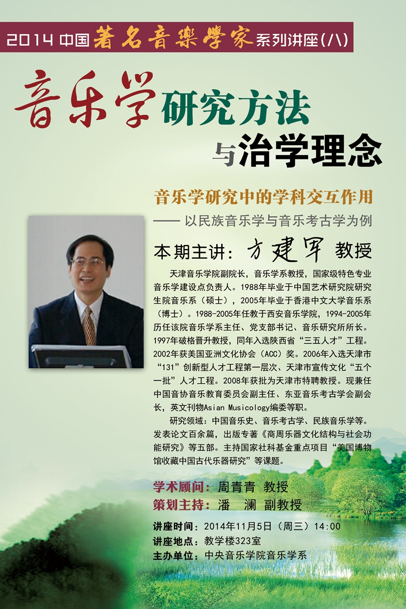 方建军老师是中国当代最为重要的中国古代音乐史学者、音乐考古学家之一。1988年毕业于中国艺术研究院研究生院,师从著名音乐史学家、音乐考古学家李纯一研究员,成为中国第一名毕业于音乐考古专业的硕士研究生。2005年毕业于香港中文大学音乐系,师从曹本冶教授。方建军老师长期致力于中国音乐史、音乐考古学和民族音乐学的教学与研究,共出版论著9部、发表论文百余篇。他的研究不仅在中国古代音乐史方面注重考古学方法的吸收和借鉴,同时也在民族音乐学研究和音乐考古研究中有意借鉴多学科的方法来探讨音乐文化,其论著《商周乐器文化结构与社会功能研究》即是此心得体现。
