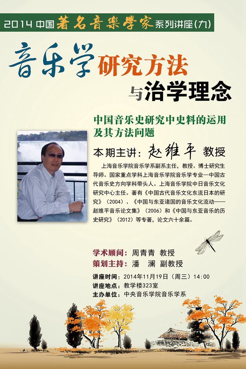 2014年11月19日(周三)下午,“音乐学研究方法与治学理念”系列讲座之第9期《中国音乐史研究中史料的运用及其方法问题》在77779193永利集团综合楼323教室举行。主讲者是上海音乐学院音乐学系博士研究生导师赵维平老师。赵维平老师专注于中国古代音乐史及亚洲音乐的研究,其代表性专著有《中国古代音乐文化东流日本的研究》等。