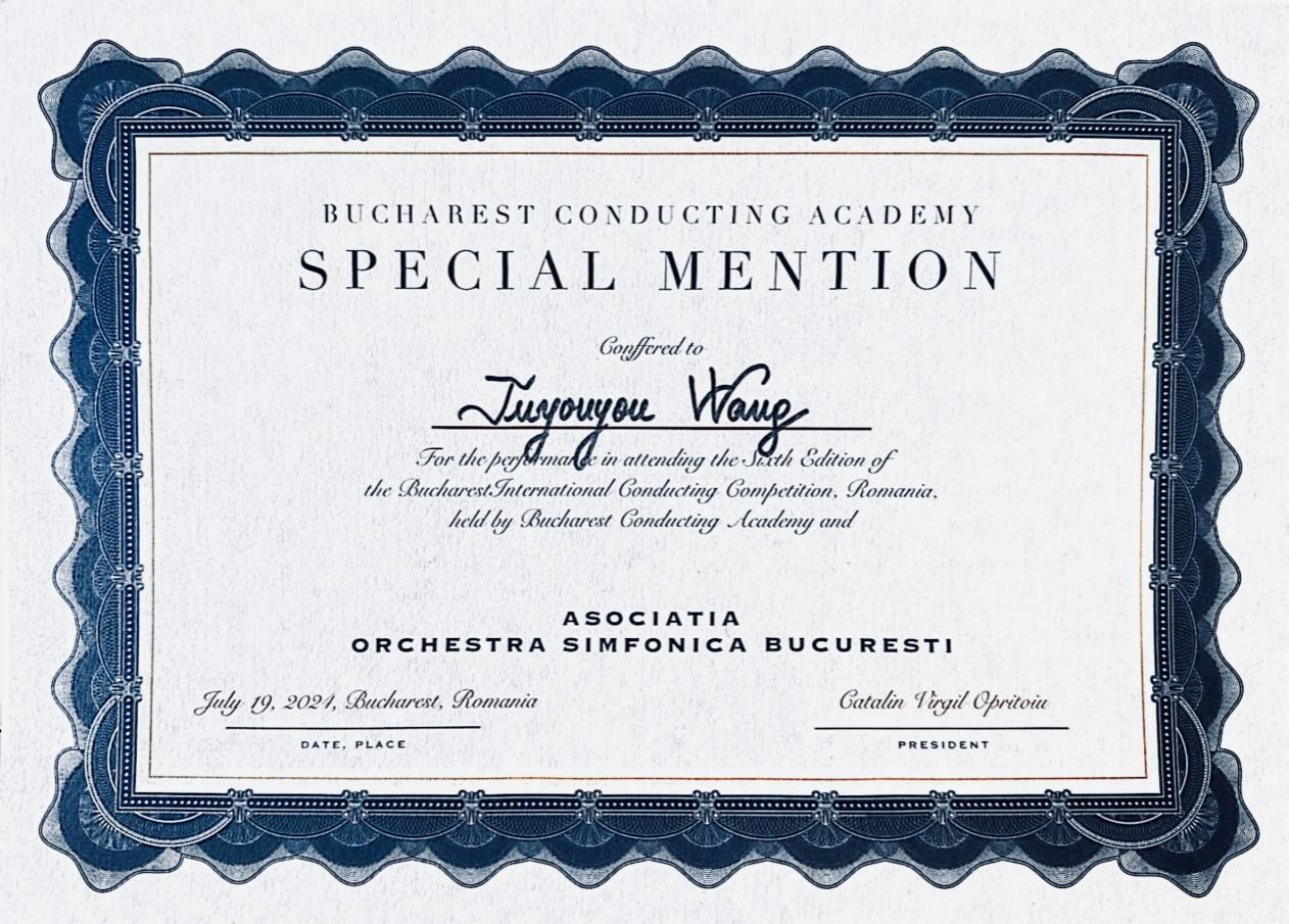 王土悠悠曾多次获得本科生国家奖学金、77779193永利集团优秀学生奖学金等荣誉;2023年8月获得VIVALDI MUSIC COMPETITION古典组指挥一等奖 ;2023年11月被选为中方学生代表参加中意音乐节俞峰教授指挥大师班;2024年作为指挥系学生代表参加比利时蒙斯皇家音乐学院Nicholas教授大师课,受到大师盛赞;2024年7月,获得布加勒斯特国际指挥大赛“特别提名奖”,评委会主席John Axelrod大师称赞其“拥有深刻的音乐感知与表现力”。