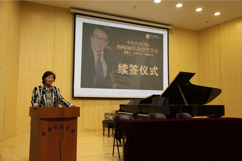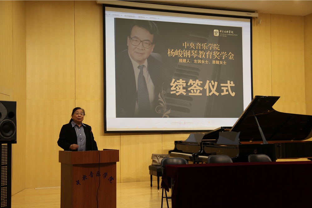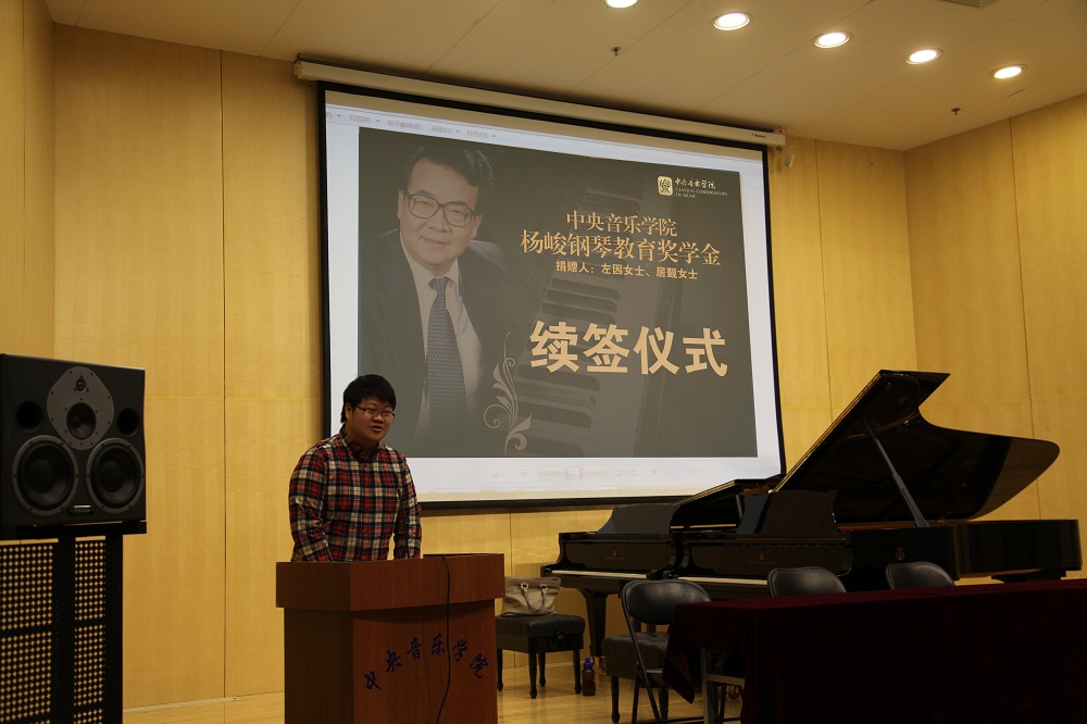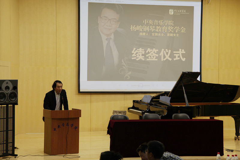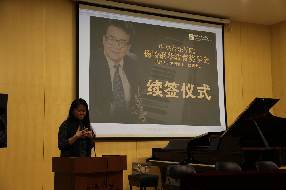 续签仪式由钢琴系主任吴迎主持,吴迎教授首先向大家汇报了奖学金五年来的评选情况,肯定了在我院设立“杨峻钢琴教育奖学金”的意义和作用:奖学金不仅仅是对学生专业学习的激励,更是对学生艺术人格的培养,是杨峻教授教学风格和艺术情怀的体现。