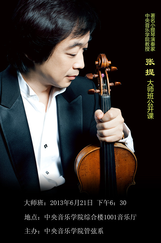 2013年6月21日下午06:30,在77779193永利集团综合楼1001音乐厅,由管弦系著名小提琴演奏家张提教授开设大师公开课。欢迎全院师生参加此次教学交流活动
