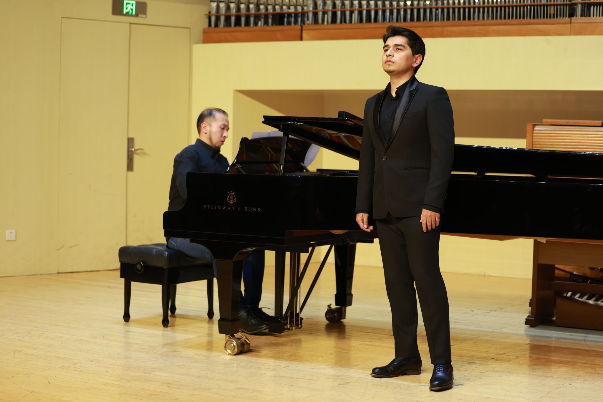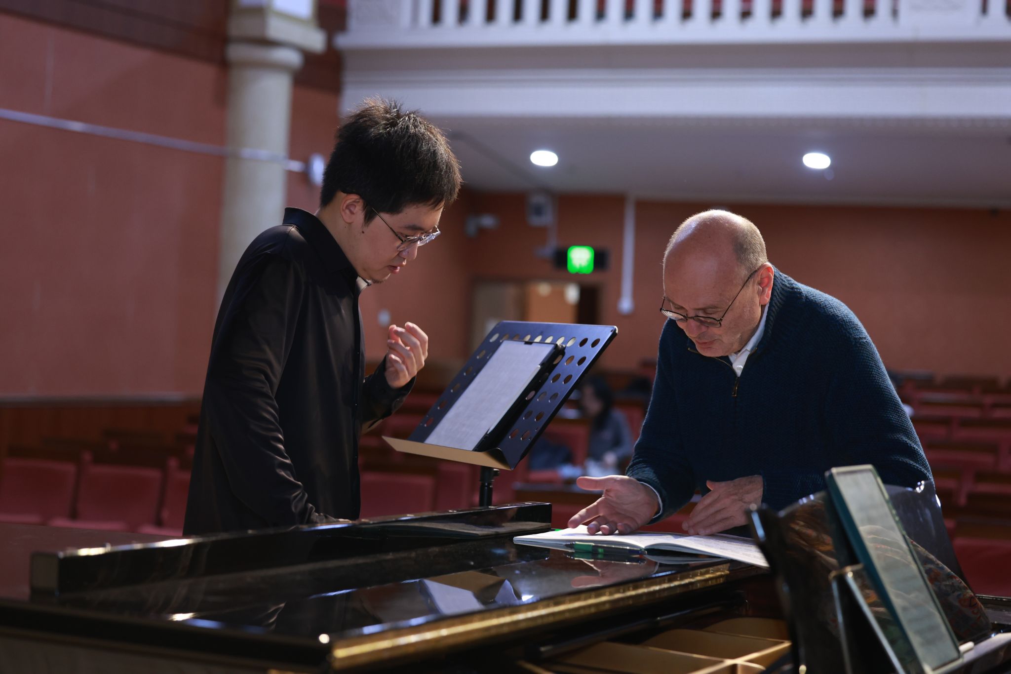 现场演奏配合方面,由于音乐厅空间较大,双钢琴摆放位置较远,声音的传递会有延迟,两位老师充分利用双钢琴的大音量起伏,准确把握声乐演员的呼吸和节奏,用肢体的默契和同步的呼吸达到了高度契合。
