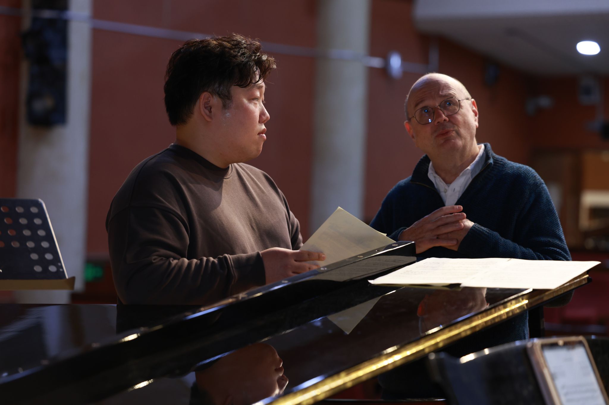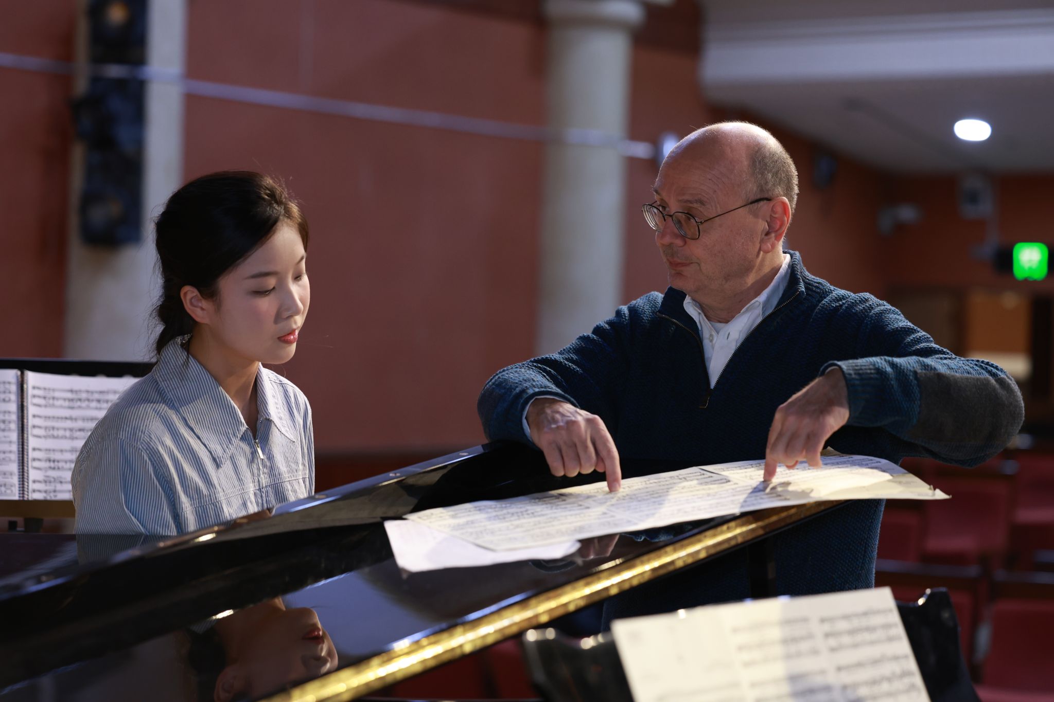 双钢琴排演方面,两位老师把歌剧钢琴缩谱伴奏中缺少的乐队声部补充进双钢琴,并根据音乐效果创编了一部分织体融入到演奏中。