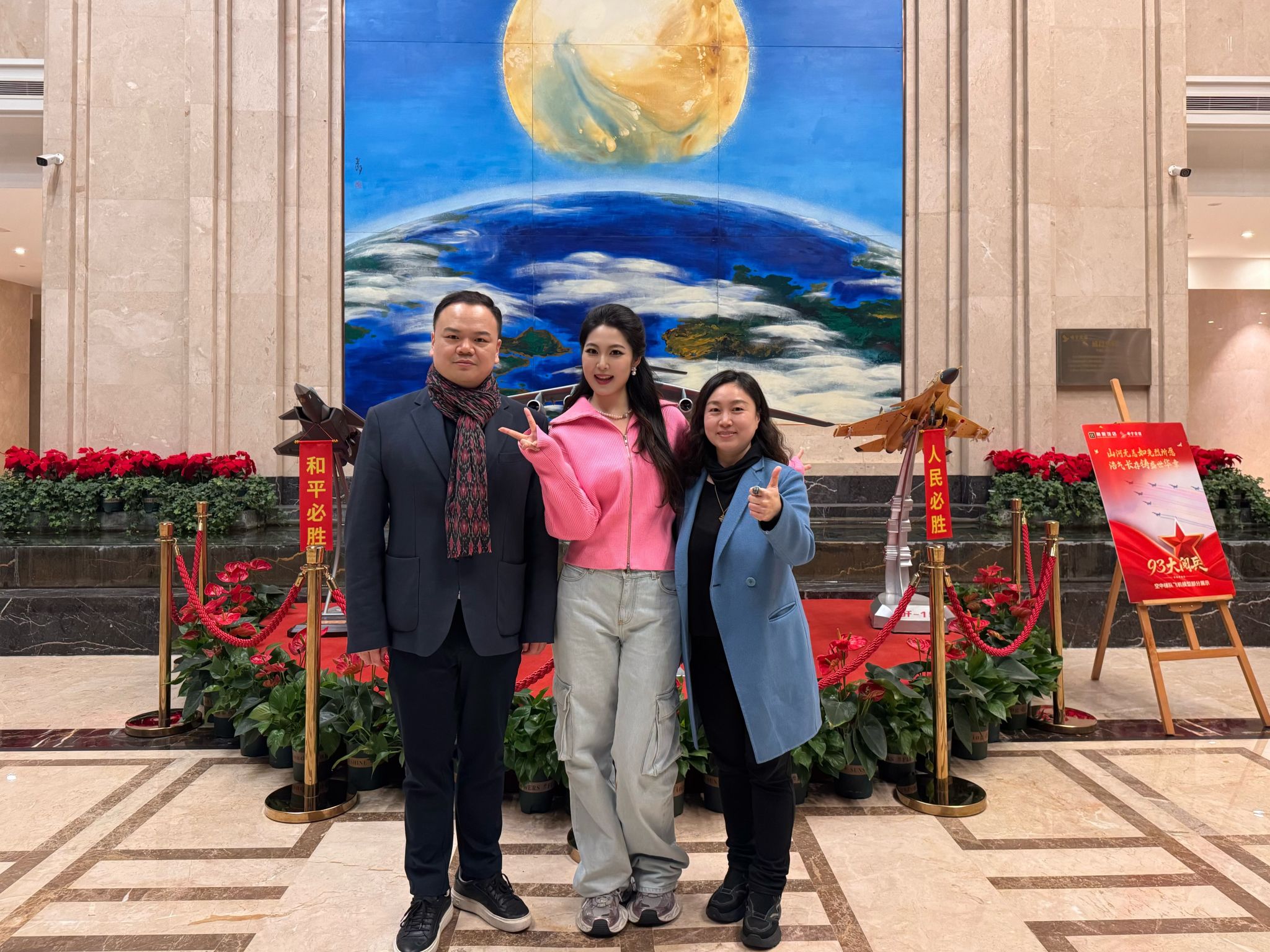 获奖学生吴思勉(中)赛后与指导教师谢天教授(左)、艺术指导陈曦副教授(右)合影留念