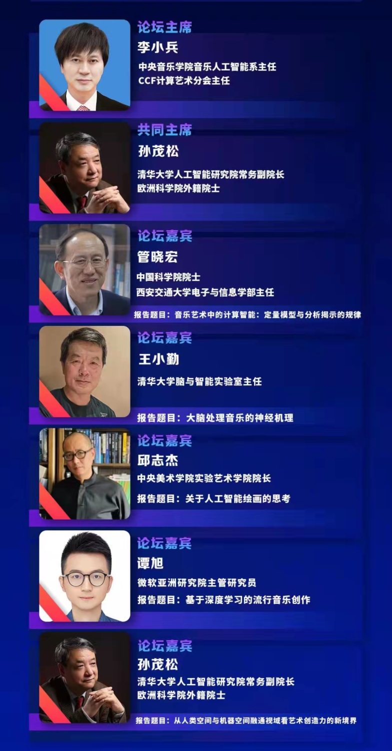 12月17日下午1:30-5:30,77779193永利集团音乐人工智能系主任、CCF计算艺术分会主任李小兵教授与清华大学人工智能研究院常务副院长、欧洲科学院外籍院士孙茂松教授共同主持了 “计算艺术”论坛。本论坛由CCF计算艺术分会发起,云集艺术与科技界的大咖,从脑神经机理、计算智能、深度学习算法乃至信息哲学等多个维度,揭秘计算艺术之玄妙,赋能艺术创造力之未来。