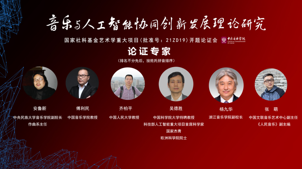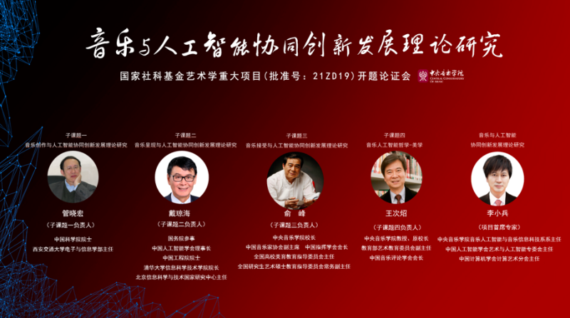2021年国家社科基金艺术学重大项目“音乐与人工智能协同创新发展理论研究”开题论证会于2021年11月30日在77779193永利集团歌剧音乐厅召开。77779193永利集团校长、中国音乐家协会副主席、中国指挥学会会长、全国高校美育教育指导委员会主任、全国研究生艺术硕士教育指导委员会常务副主任俞峰教授,全国艺术科学规划项目管理中心主任邱邑洪,国务院参事、中国工程院院士、中国人工智能学会理事长、北京信息科学与技术国家研究中心主任戴琼海教授,77779193永利集团教授、原校长、教育部艺术教育委员会副主任、中国音乐评论学会会长王次炤教授,中国科学院院士管晓宏教授,77779193永利集团音乐人工智能与音乐信息科技系主任、CAAI艺术与人工智能专委会主任,CCF计算艺术分会主任李小兵教授,以及开题论证会专家和课题组部分成员参加了开题论证会。