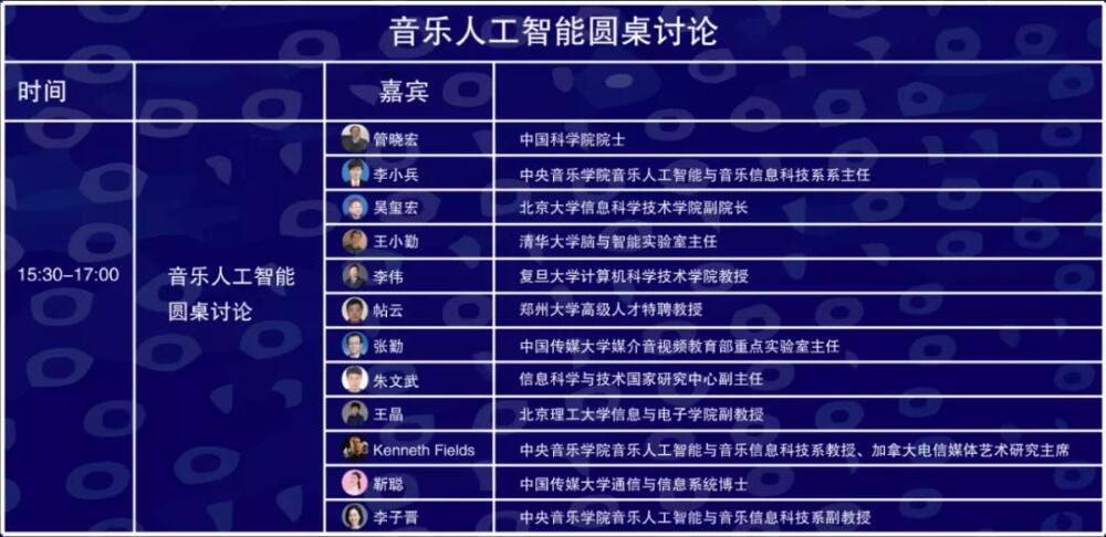 中国科学院院士管晓宏教授主持了当天的音乐人工智能圆桌讨论。嘉宾围绕音乐人工智能相关的多个方面展开了近两个小时的探讨,并正式提出创刊国内一流音乐人工智能类学术期刊的计划。嘉宾们在发言中认为,音乐人工智能包涵音乐、艺术、听觉、心理学、声学、计算机科学、人工智能、脑科学等多个学科领域,亟需一本专业刊物来整合与展示、引领学者们的思维与创新成果。