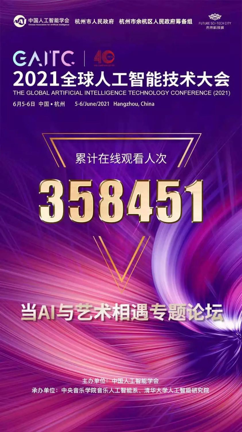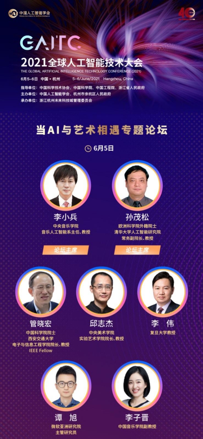 2021年6月5-6日,由中国人工智能学会、杭州市人民政府主办的“2021全球人工智能技术大会”在杭州隆重召开。6月5日,永利音乐人工智能与音乐信息科技系主任李小兵教授,欧洲科学院外籍院士、清华大学人工智能研究院常务副院长孙茂松教授担任论坛主席的“当AI与艺术相遇专题论坛”成功举办。