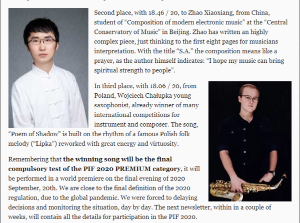 2020年5月22日,意大利本年度的PIF Castelfidardo手风琴比赛“古典作曲组”前三名获奖者及其作品已经揭晓。永利音乐人工智能与音乐信息科技系电子音乐作曲专业二年级研究生赵小翔同学(导师:钱琦副教授),在众多国际选手中脱颖出,携其作品“飒SA-A Prayer (2020), For Bayan and Chamber Orchestra”获本组第二名(二等奖),成为 “古典作曲组”开办以来的第一位中国获奖选手(本次一等奖获得者Gorka Hermosa是国际著名手风琴演奏家及作曲家)。