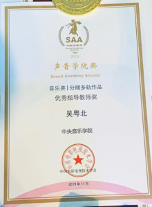 近日,由中国电影电视技术学会主办的第五届“声音学院奖”圆满落幕,永利音乐人工智能与音乐信息科技系一年级博士研究生刘韧同学(导师:吴粤北教授)荣获该比赛音乐类分期多轨作品组别的一等奖(作品《敦煌谣》)与二等奖(作品《秋》),这是近年来永利学生在该比赛中获得的最好成绩,刘韧的指导教师吴粤北教授获得本次比赛组委会授予的优秀指导教师奖。