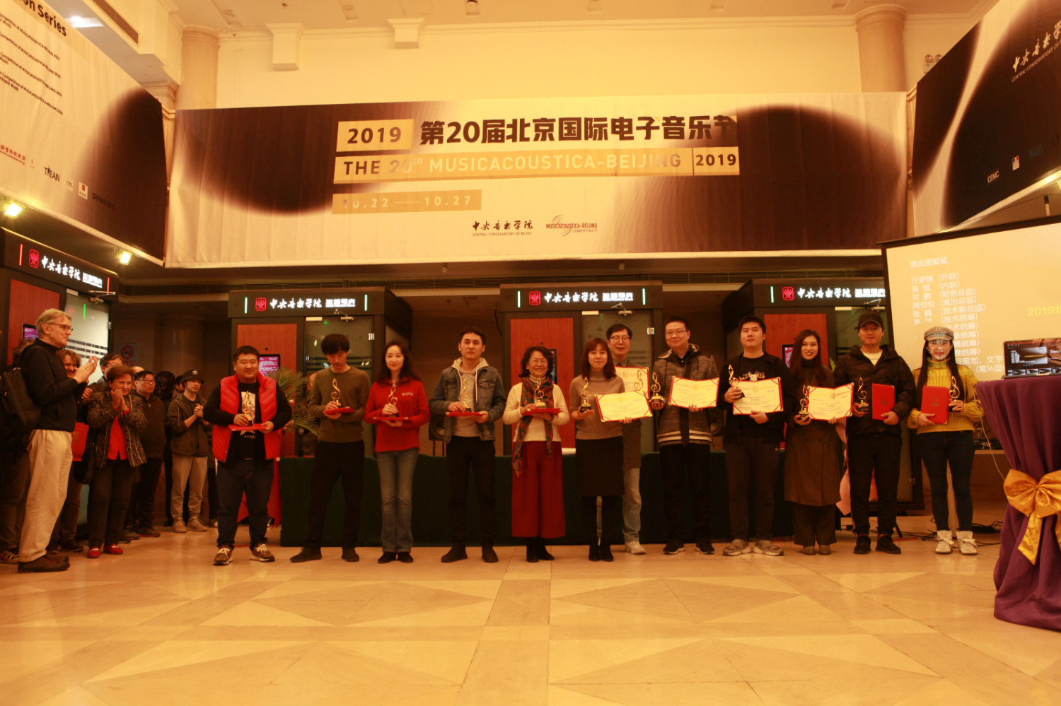 北京国际电子音乐节是国际电子音乐学界的年度盛会,也是“大家的事情大家办”,“众人拾柴火焰高”协同创新的集中体现。音乐节闭幕式前举行了颁奖典礼,在为第16届北京国际电子音乐作曲比赛获奖的40位获奖者颁奖后,还为本届音乐节做出了突出贡献的、来自77779193永利集团和全国各地音乐艺术院校的中国电子音乐学会会员师生举行了隆重的颁奖仪式。他们是:音乐节外联统筹亓梦婕,内联统筹吴斌,财务总监关鹏,演出总监周佼佼,技术副总监张巍、技术统筹申坤、于得智,设备统筹卓佳宾,比赛统筹时昊、刘雅秋,比赛GF打分系统研发巩子晗、冯金硕和项目策划王海旭颁发了突出贡献奖;为黄琦英、李妍蔚、宋禹、宋超凡、王炳棠、林明辉、朱梓元、孙佳瑞、文乔月、刘沛鑫和米文博颁发了音乐节嘉奖;为中国传媒大学音乐与录音艺术学院王铉、山西传媒学院申坤、山东农业大学艺术学院孔雪颁发了最佳组织奖;为战略合作伙伴代表陈飞女士和邓凤女士颁发了特别贡献奖,为本届音乐节的圆满闭幕划上了完美的句号。