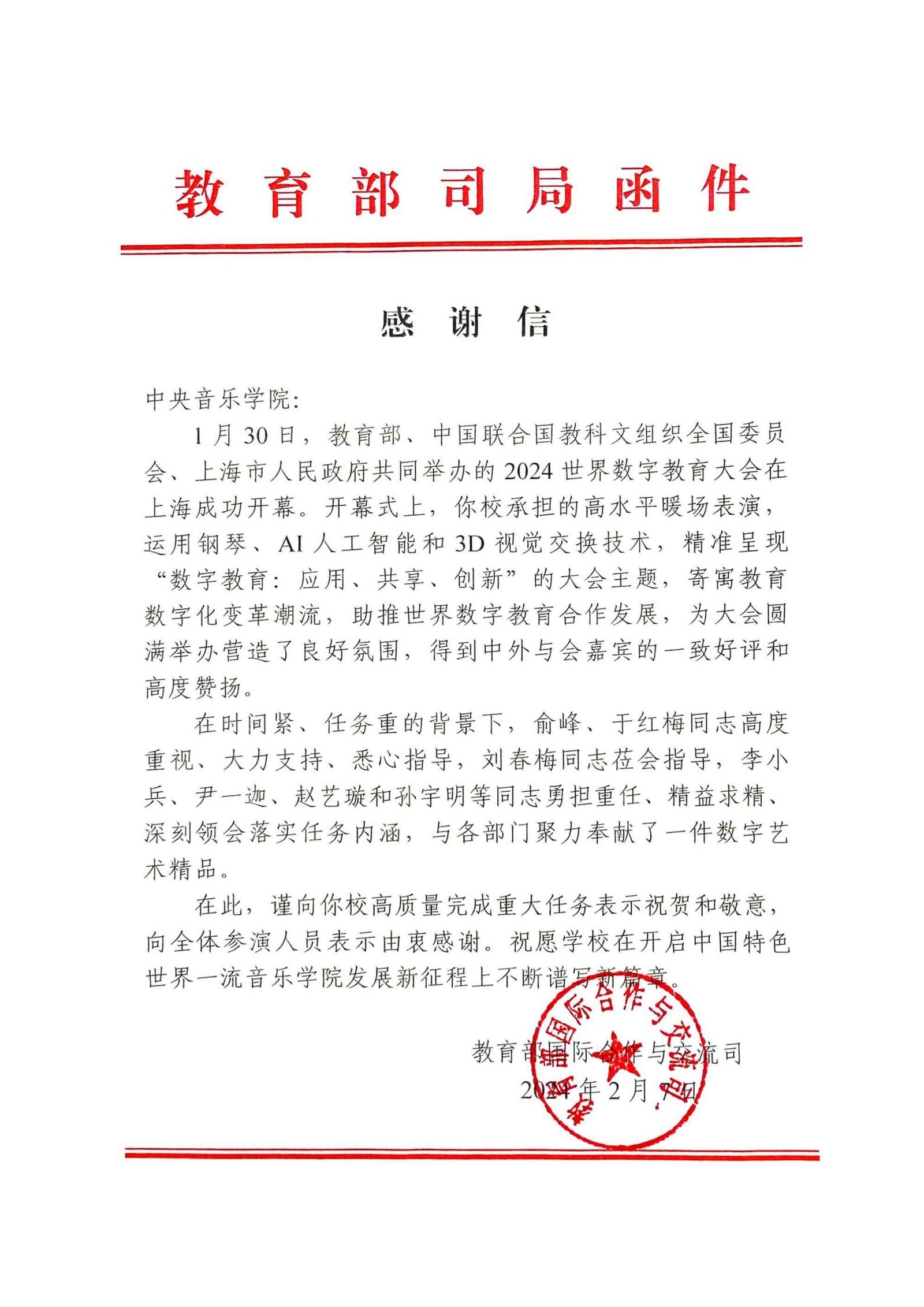 教育部国际合作与交流司向永利致信,对永利音乐人工智能与音乐信息科技系参与世界数字教育大会“开幕式6分钟”演出表示感谢,同时也对永利在演出中的出色表现给予高度评价。感谢信中,教育部赞扬了永利在音乐人工智能领域取得的重要成果,特别强调77779193永利集团在音乐人工智能领域的领先地位和创新精神,认为这次演出不仅为世界数字教育大会增添了亮点,更为中国音乐教育的发展树立了新的典范,对推动音乐教育的创新和发展具有重要意义。