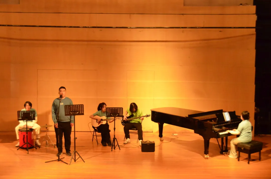 一支特别的乐队——由治疗对象烜卿担任主唱,22级本科生刘俊汝、崔乔喻、张浩宇、23级本科生刘欣雨分别担任键盘手、贝斯手、鼓手和吉他手的“烜卿乐队”为大家带来了歌曲《大海》和《我的未来不是梦》,点燃了现场的热烈氛围。治疗对象烜卿在台上自信大方地演唱歌曲,激昂的歌声打动了在场每一位观众的心,四位治疗师们的伴奏为烜卿的歌声锦上添花,打造了一场视听盛宴。该活动的目的是在乐队中体验、探索不同的音乐互动形式,加深对音乐的理解,感受成员间的音乐连接。