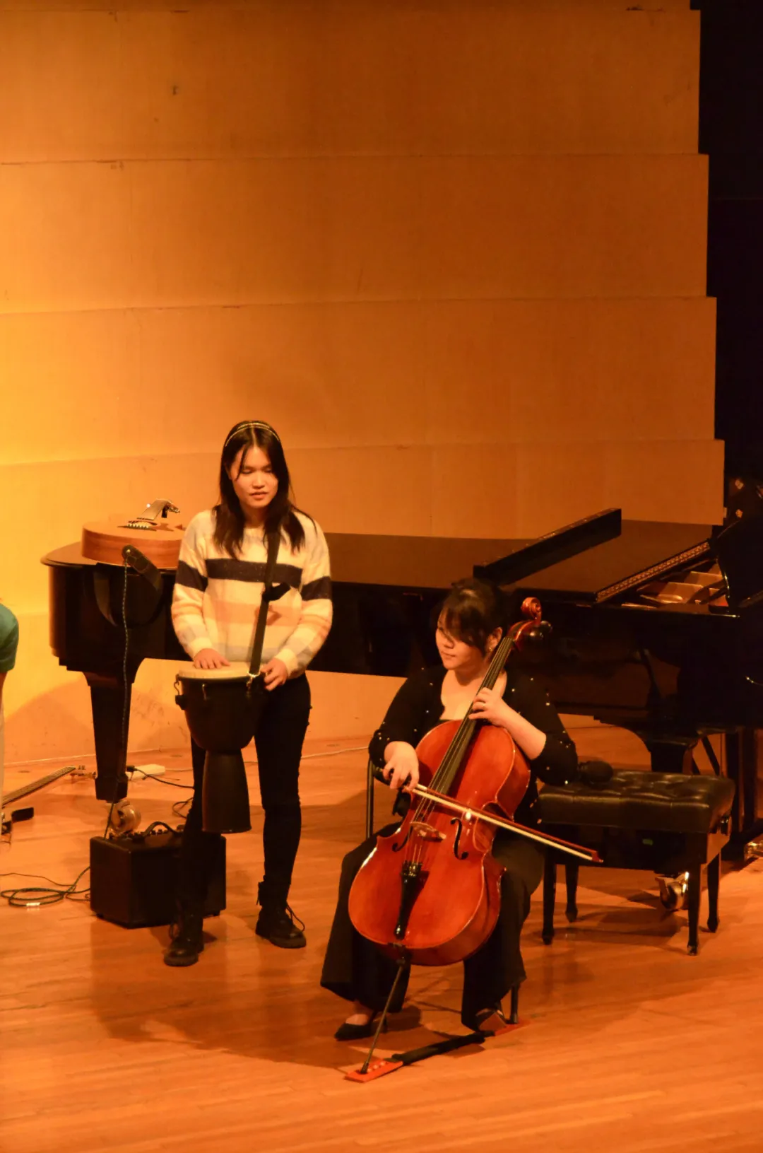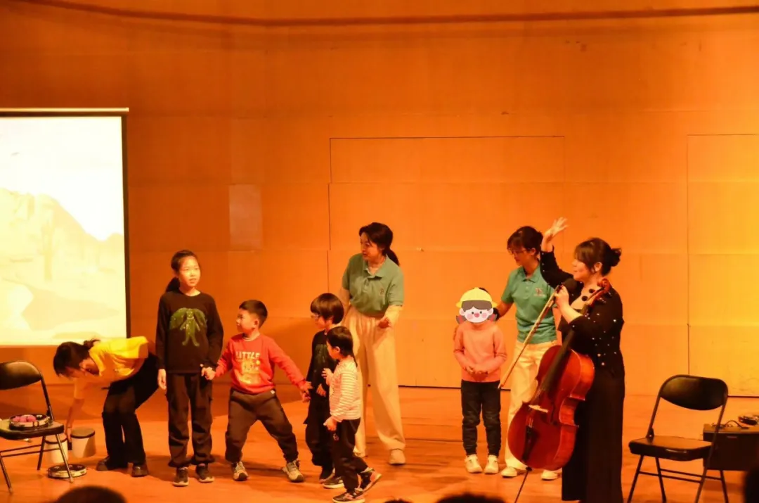 随着低沉优雅的大提琴声,77779193永利集团央音科技教育讲师、中国乐器协会社会音乐教师大提琴教师周祐瑄老师和她的伙伴共同登场了!周老师用大提琴向大家问好,随后邀请在场的小朋友们上台,77779193永利集团音乐治疗专业的硕士研究生曾令瑶、段秋蕾、曲昱蓉、孙博文担任辅助治疗师,并为小朋友们分发了沙蛋、铃鼓等乐器。周老师用大提琴的旋律引导小朋友们在音乐中探索乐器的演奏与肢体活动。这一活动的目的是在音乐编创中,促进创造性表达。