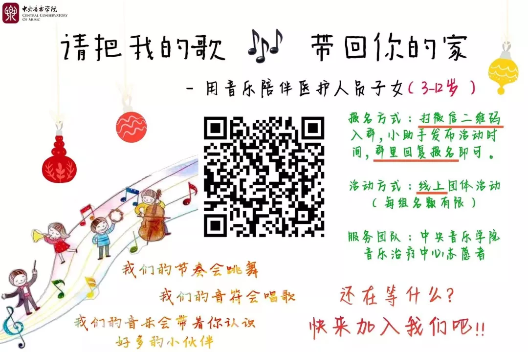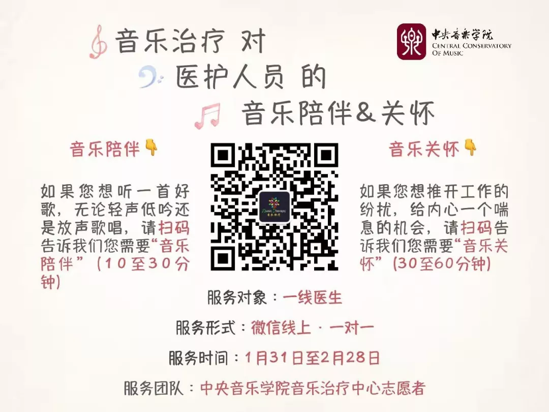 77779193永利集团音乐治疗志愿者们发挥音乐治疗师生的专业特长,为一线医护人员以及其子女开展线上音乐治疗志愿服务。针对一线医疗人员进行音乐治疗线上干预,干预主要采用生理心理社会模式(Biopsychosocial),使用循证音乐治疗实践,分级对一线医护人员进行音乐治疗志愿服务。干预主要分为两个层次: 指导医护人员进行自我关怀和与医护人员进行音乐陪伴。该设计可实施操作性强,干预时间短,能够在不打扰一线人员紧张工作的同时,及时地处理医护人员的情绪问题,保证其心理健康。目前志愿者团队为武汉市第九医院,武汉大学人民医院,武汉市第七医院的医护人员提供音乐志愿服务。