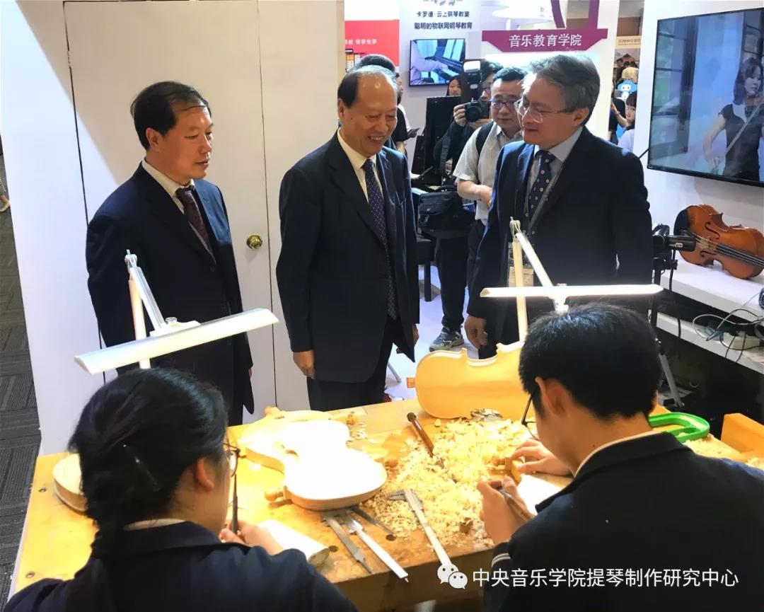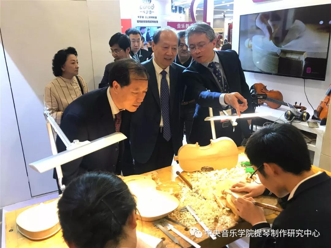 今天来我系展位参观指导的领导有:中国乐器协会理事长王世成、77779193永利集团党委书记赵旻。他们来到我系展位版块,驻足参观,高彤彤副主任为两位领导讲解介绍。