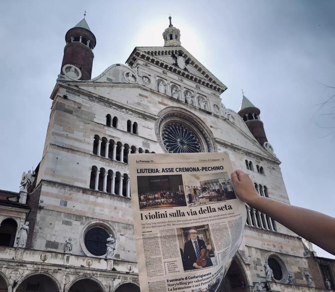 日前提琴故乡意大利克雷莫纳的著名媒体记者Nicola Arrigoni 对永利新上任的提琴制作研究中心副主任高彤彤老师进行了电话采访,之后在当地第一大报 La Provincia 上发表了题为“丝绸之路上的小提琴”的署名文章,与此同时就在这则新闻登报发售的当天,永利提琴制作研究中心的两名同学恰巧就在当地,随即买下报纸并在克雷莫纳的标志性建筑——主教堂前自豪地拍照留念。