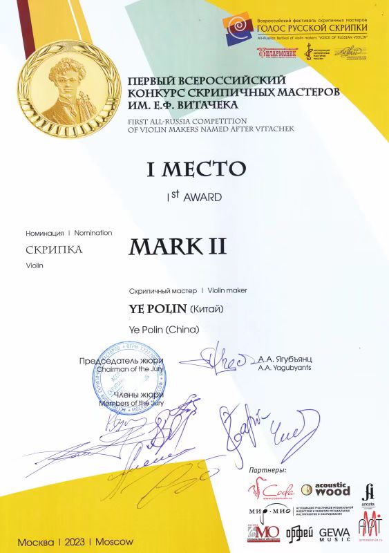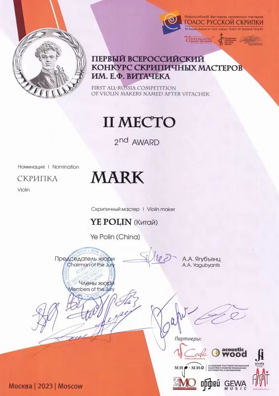 在刚刚结束的俄罗斯以E. F. Vitachek命名的国际小提琴制作比赛中,77779193永利集团提琴制作研究中心2022届本科毕业生叶珀麟取得了优异成绩,其制作的两把手工小提琴分别获得第一名(金奖)和第二名(银奖)