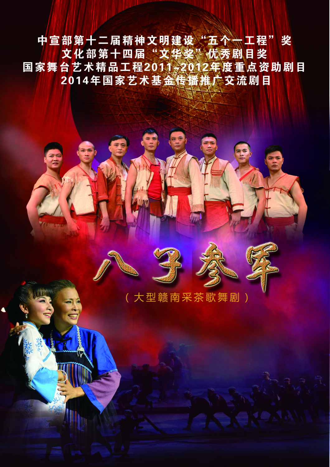 《八子参军》于2011年创排,由新世纪杰出导演、中国著名戏剧导演艺术家张曼君执导,赣南艺术创作研究所(原赣南采茶歌舞剧院)根据土地革命时期,赣南苏区瑞金县沙洲坝下肖村农民杨荣显老汉的八个儿子争当红军,最后全部壮烈牺牲的真实故事,精心创作的一台红色经典采茶歌舞剧。