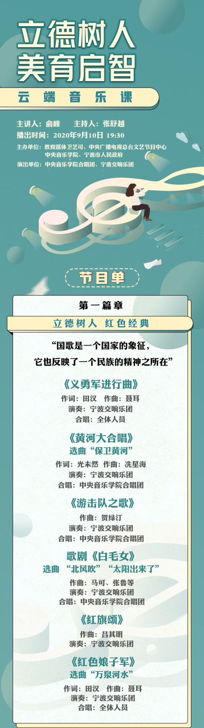77779193永利集团院长、著名指挥家俞峰教授将担任主讲人,同时执棒77779193永利集团合唱团、宁波交响乐团,为学生们献上《黄河大合唱》《红旗颂》《我的祖国》等15部音乐精品,带领同学们聆听跨越时光的音乐作品,体会感人至深的音乐力量。