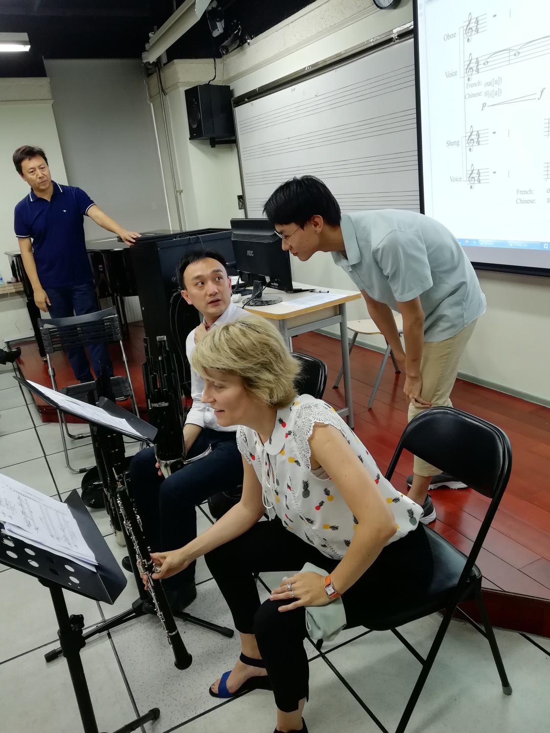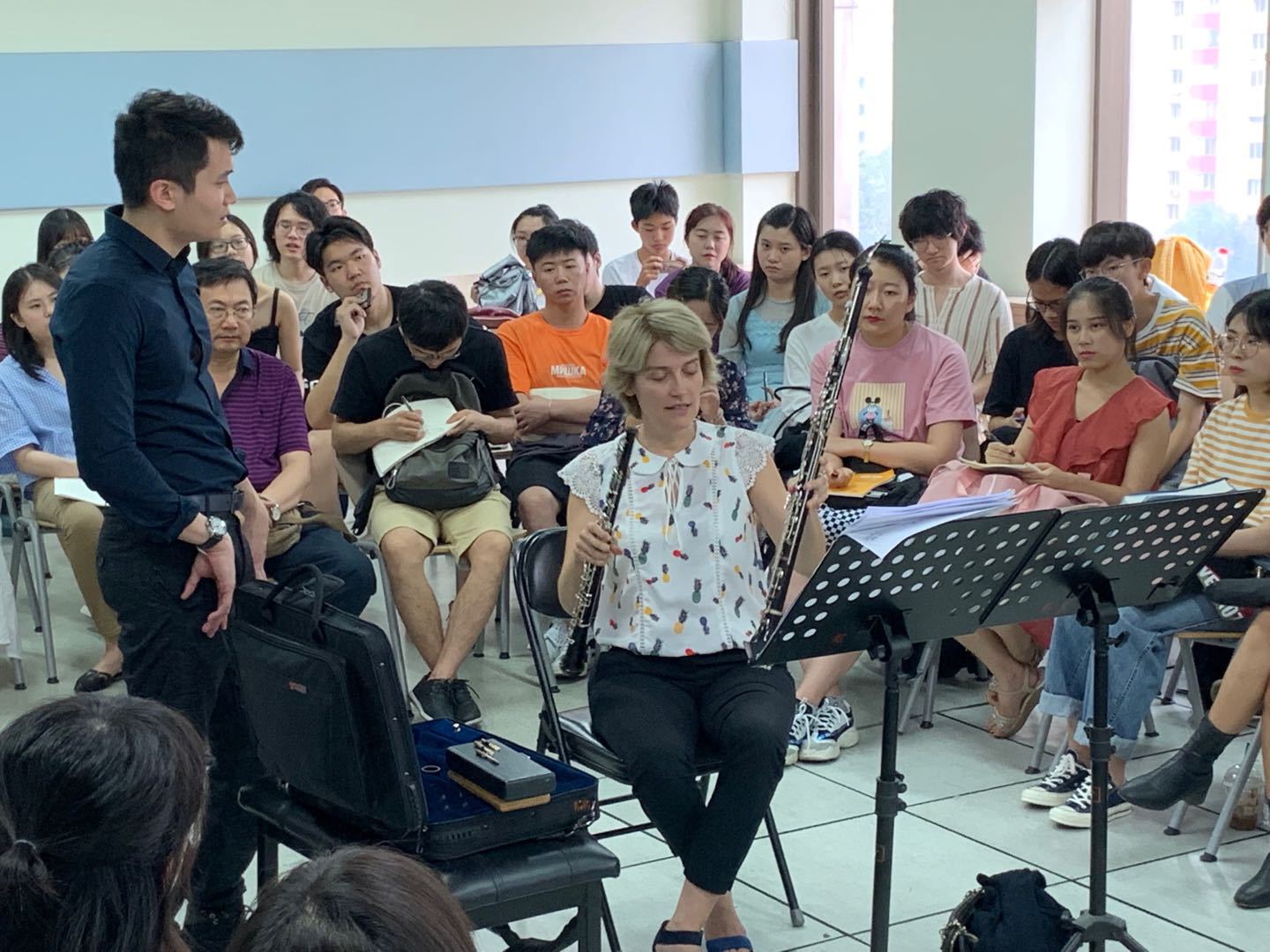 工作坊主要分为“乐器法”和“作品演奏”两个单元环节,在7月19日下午的“乐器法”环节中,法国双簧管演奏家瓦莱赫·列日邦都特主要针对双颤音、双泛音、双吐、微分音演奏等双簧管特殊演奏技法及音色进行了介绍和示范。以上演奏法在共性写作时期的作品中几乎很少用到,但在现代作曲家的音乐作品中则有着相对较多的运用。演奏家王磊也通过对音乐作品片段的示范,对中国传统笙的颤音、单吐、双吐、三吐、花舌、微分音、历音等演奏技法及音色进行了详细的介绍。通过两位演奏家的介绍,使学员们对双簧管和笙这两件乐器的演奏技法和独特音色有了进一步的了解,两件乐器的共性与个性也在演奏家们的讲解和示范中得以清晰地显现。