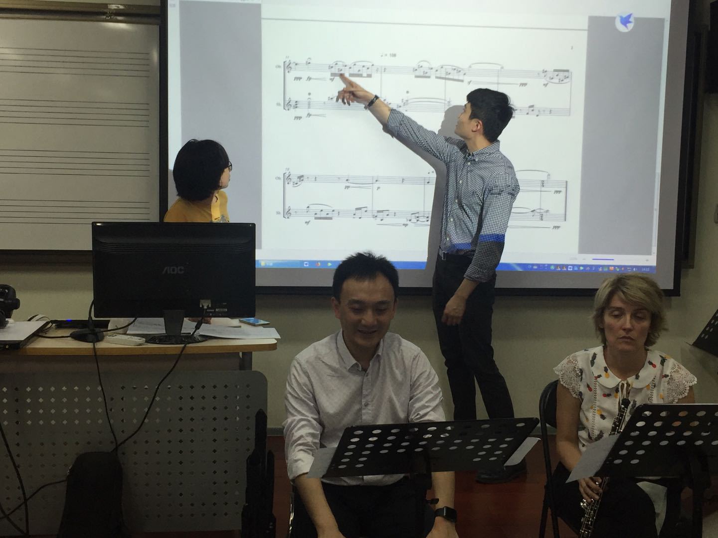7月20日下午的“作品演奏”环节由77779193永利集团作曲系副主任常平教授主持。他强调,本次“双簧管与笙工作坊”一方面是想让学员们重新认识这两件乐器。以双簧管为例,很多人对于它的印象仅停留在优美、抒情性强,音色具有浓郁的田园特征上,但这还不够全面,它还有很多不同的音色,需要大家去进一步了解。因此,本次工作坊邀请到了瓦莱赫·列日邦都特和王磊这二位演奏家,就这两件乐器为大家做详细的介绍,会对学员们今后的创作有所帮助。另外,北京国际作曲大师班一直关注中国民乐与西方乐器应该如何配合,这也引发了很多作曲家在这方面的思考,例如什么样的中、西乐器可以搭配,它们之间的搭配是否具有可行性等。因此,激发年轻作曲家们对创作的思考、在创作中锻炼他们的实践能力,也正是本次工作坊的又一目的。