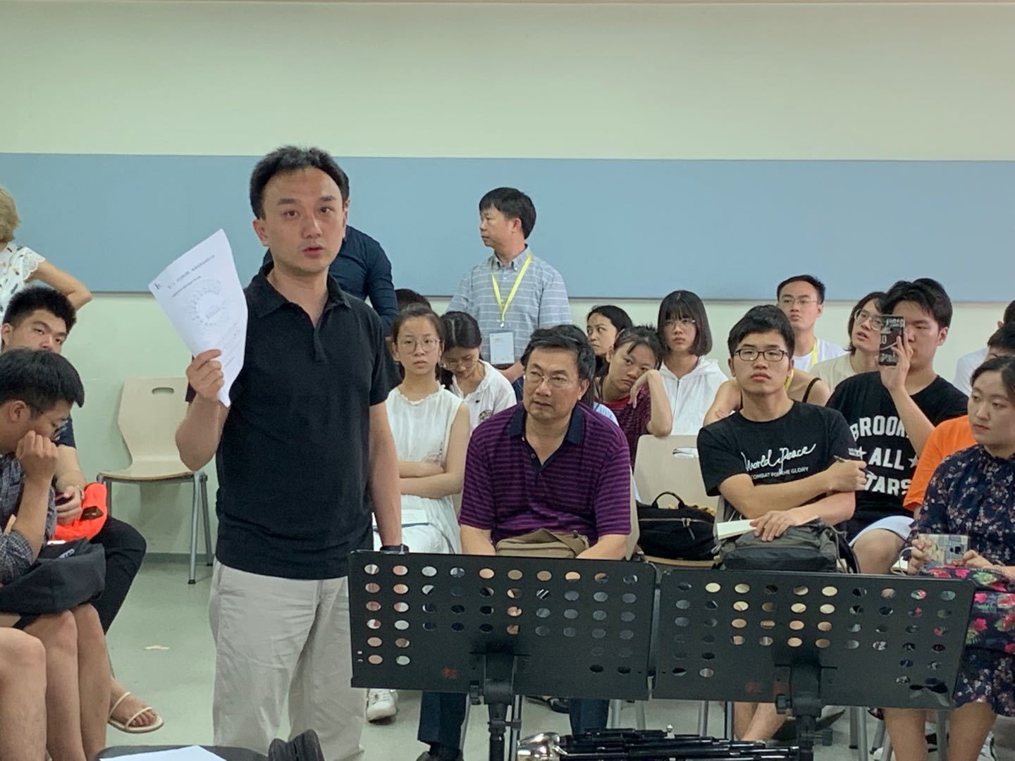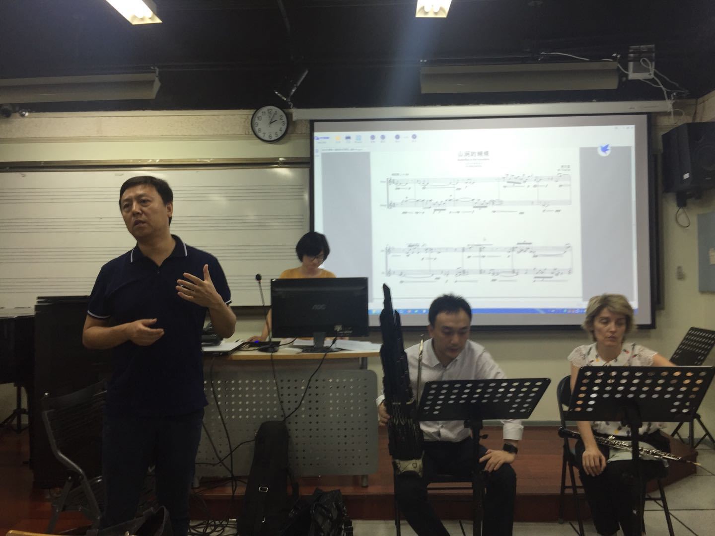 “作品视奏”环节共演奏了11位学员的作品,常平教授和两位演奏家分别从作曲和演奏的角度,给学员们提出了中肯的建议。整体来看,学员们的作品都很有想法和创意,但在作品演奏的过程中,也暴露出了不少问题。这些问题主要集中在记谱方式不够简洁明了、表情记号不够详细、音响平衡性有待加强、音程跨度过大、有些演奏技法或音响无法实现(如笙的下滑音、双簧管复杂的旋律与人声无法同时进行)或是演奏指法不顺手等。