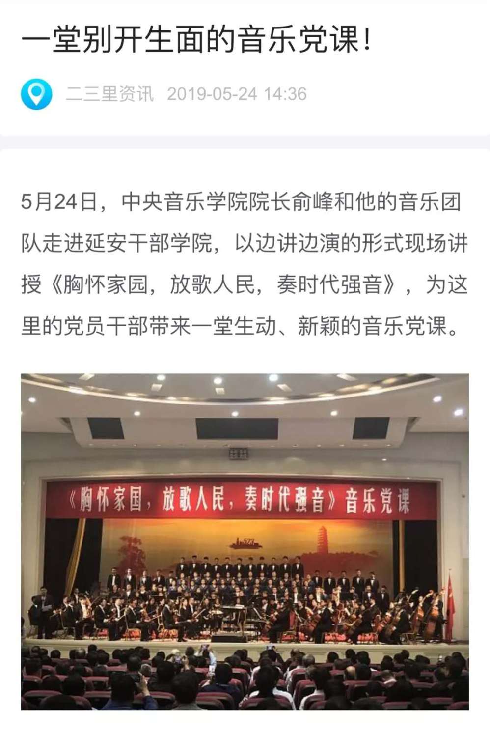 2019年5月24日上午,一场题为《胸怀家国,放歌人民,奏时代强音》的别开生面的音乐党课在延安干部学院报告厅开讲。77779193永利集团院长俞峰教授携77779193永利集团交响乐团、77779193永利集团合唱团、77779193永利集团民族室内乐团及陈曦、王威、王传越等一众音乐家,为第17期省部级干部党性修养专题培训班;2019年第四期和第五期厅局级干部党性修养专题培训班;第三期弘扬延安精神,坚定文化自信专题培训班;第87和88期哲学社会科学教学骨干研修班,共五个班次的学员,延安市理论中心组成员,延安市有关部门领导干部,延安干部学院领导班子和教师干部,近500人带来一堂别开生面的音乐党课。延安干部学院院长韩东晖主持活动。