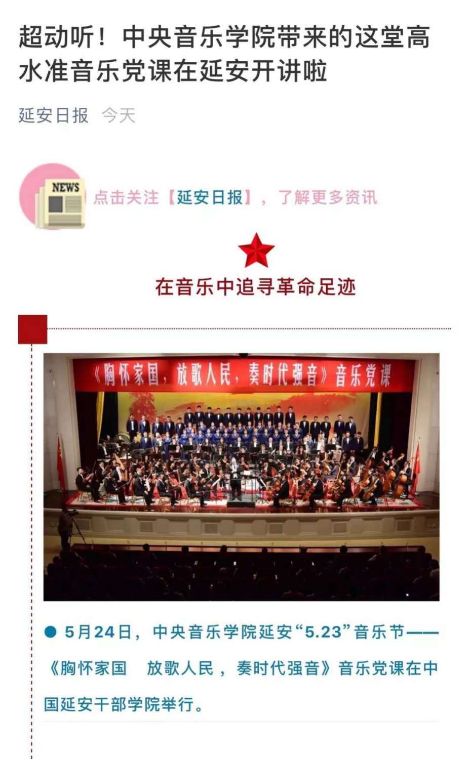 《义勇军进行曲》、《黄河大合唱》、《白毛女》、《红色娘子军》、《红旗颂》…… 在革命圣地延安欣赏经典名曲、重温革命历史、感悟延安精神,具有特殊的意义。传唱红色经典,传承革命精神,这一堂别开生面的音乐党课,让我们从经典中汲取精神营养,从经典中汲取奋斗力量。