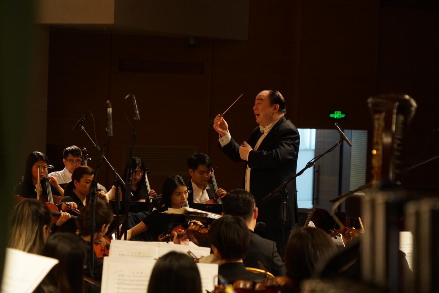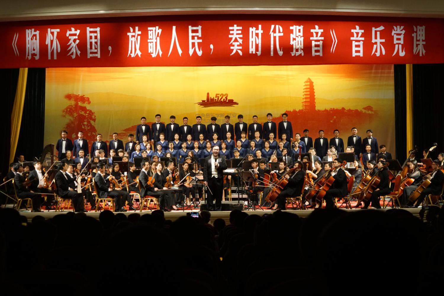 最后俞峰院长请出屡次摘得国际大赛金奖的优秀男高音歌唱家王传越、女高音歌唱家王威演唱《我和我的祖国》。最后在俞峰院长的指挥下全场学员和交响乐队、合唱队共同高唱《歌唱祖国》结束了这场震撼人心的党课。