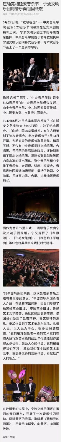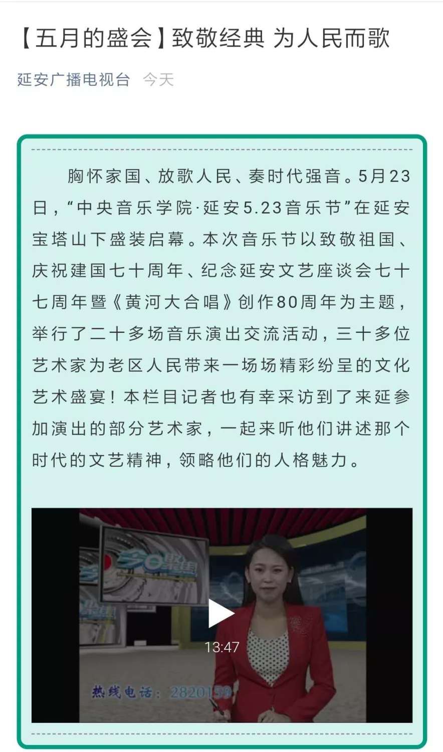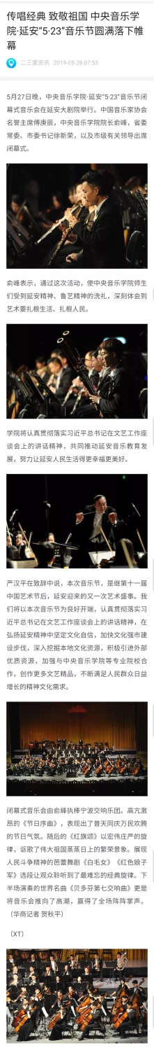 俞峰院长表示,通过这次活动,使77779193永利集团的师生们受到延安精神、鲁艺精神的洗礼,不忘初心,传承鲁艺红色基因,深刻体会到艺术要扎根生活、扎根人民,以人民为中心。此次音乐节从开幕式到每一场大师课、专家课、座谈会、音乐会、艺术交流活动,场场爆满、座无虚席,观众的真诚和热烈反响令我们非常感动。延安人民对艺术的喜爱和如饥似渴的追求、对艺术家的尊重、对艺术作品的感悟、欣赏音乐会的很高的素养都给我们留下了深刻的印象。下一步77779193永利集团会与延安大剧院充分合作,策划更多的音乐活动,持续选派77779193永利集团优秀的师资力量不断到延安来为延安音乐教育工作者进行培训,逐步提高延安的音乐教育水平。77779193永利集团.延安5.23音乐节是一座桥梁,一条纽带,一个起点,我们将在每年的5月23日、10月15日在延安举办音乐节,纪念延安文艺座谈会讲话、学习贯彻习近平总书记在文艺工作座谈会上的讲话精神,和延安一起共同努力为新时代的文化繁荣发展、为延安人民的幸福生活、为延安的音乐教育做出新的贡献。
