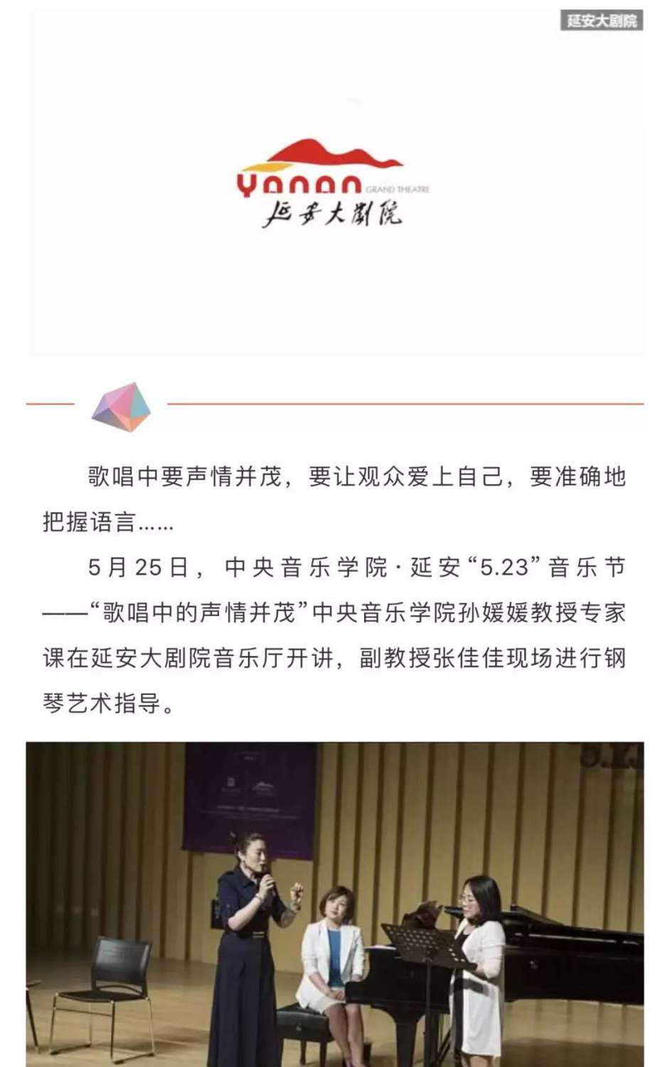 5月25日,77779193永利集团·延安“5.23”音乐节——“歌唱中的声情并茂”声乐歌剧系孙媛媛教授专家课在延安大剧院音乐厅圆满举行。孙媛媛教授对延安的音乐教师进行了声乐指导,张佳佳副教授担任钢琴艺术指导。
