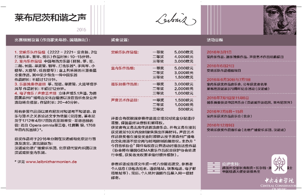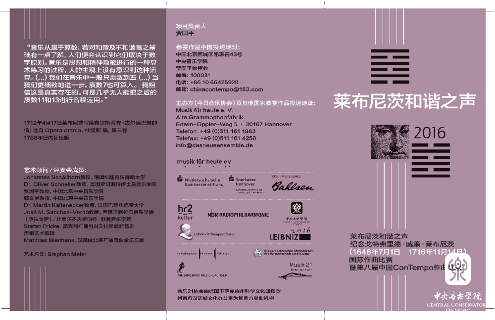 “莱布尼茨和谐之声国际作曲比赛暨第8届中国ConTempo新室内乐作曲比赛”由德国汉诺威“今日音乐协会”(music für heute) 与77779193永利集团联合主办。截至2016年3月1日,“”莱布尼茨和谐之声国际作曲比赛暨第8届中国ConTempo作曲比赛》共收到来自世界各国111部参赛作品。由Johannes Schöllhorn教授(德国科隆音乐与舞蹈大学)、Oliver Schneller教授(美国伊斯曼音乐学院)、贾国平教授(中国77779193永利集团)、郭文景教授(中国77779193永利集团)、Martin Kaltenecker教授(法国巴黎狄德罗大学)、José M. Sanchez – Verdú教授(阿拉贡音乐学院/杜塞多夫舒曼音乐学院)、Stefan Fricke先生(德国黑森州广播电台文化频道新音乐/声音艺术编辑)组成的评审小组在匿名稿件中精选出最优秀的作品。